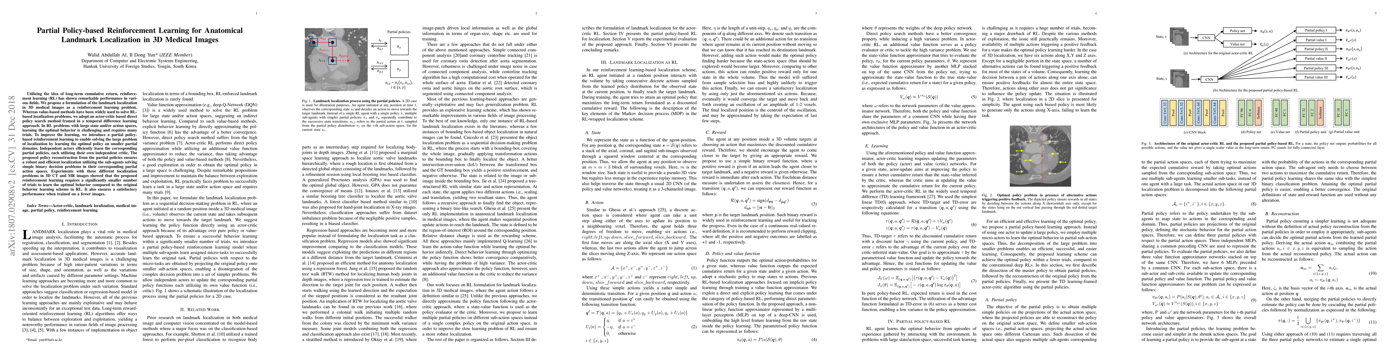 This paper proposes a partial policy-based reinforcement learning approach for anatomical landmark localization in 3D medical images, leveraging actor-critic methods and temporal difference learning. It introduces sub-agents to learn partial policies in smaller domains, enabling efficient and robust localization with fewer trials compared to traditional methods.