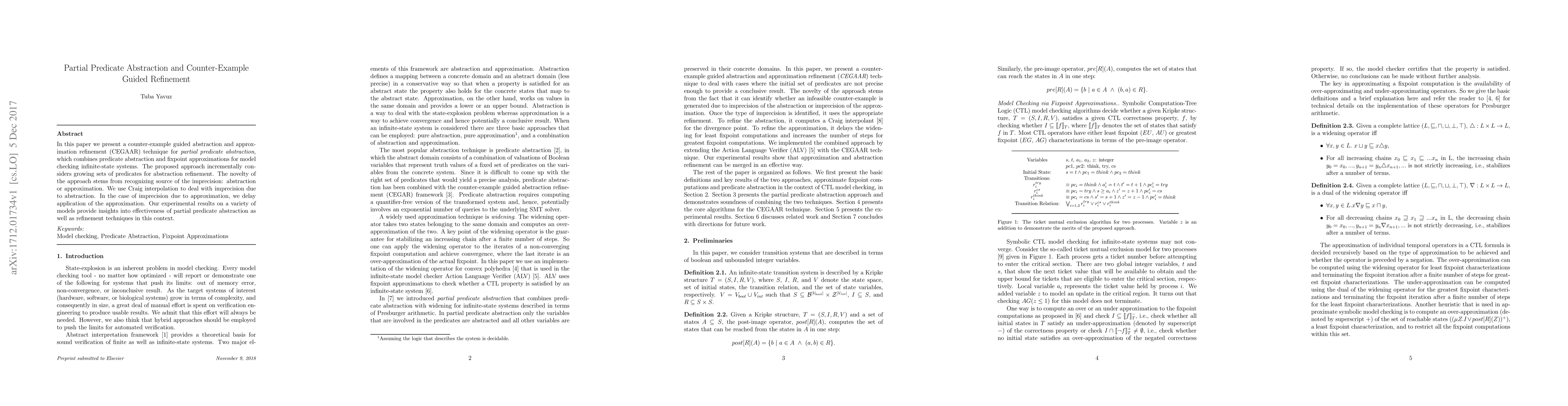 This paper introduces a CEGAAR technique for partial predicate abstraction, combining abstraction and approximation refinement for model checking infinite-state systems. The method identifies whether imprecision comes from abstraction or approximation, using Craig interpolation for abstraction issues and delaying approximation for the latter. Experimental results demonstrate the effectiveness of the proposed refinement approach.