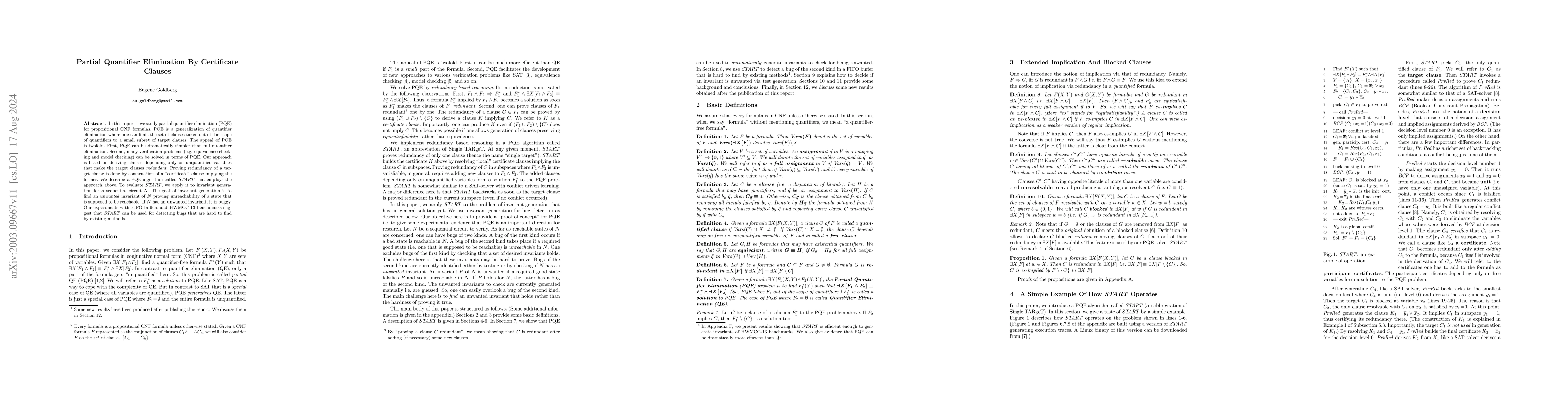 This paper proposes a partial quantifier elimination (PQE) algorithm named START for simplifying verification problems, especially for incremental computations like equivalence checking and model checking. START generates certificate clauses to show redundancy of target clauses, aiding in detecting bugs in sequential circuits by finding unwanted invariants.