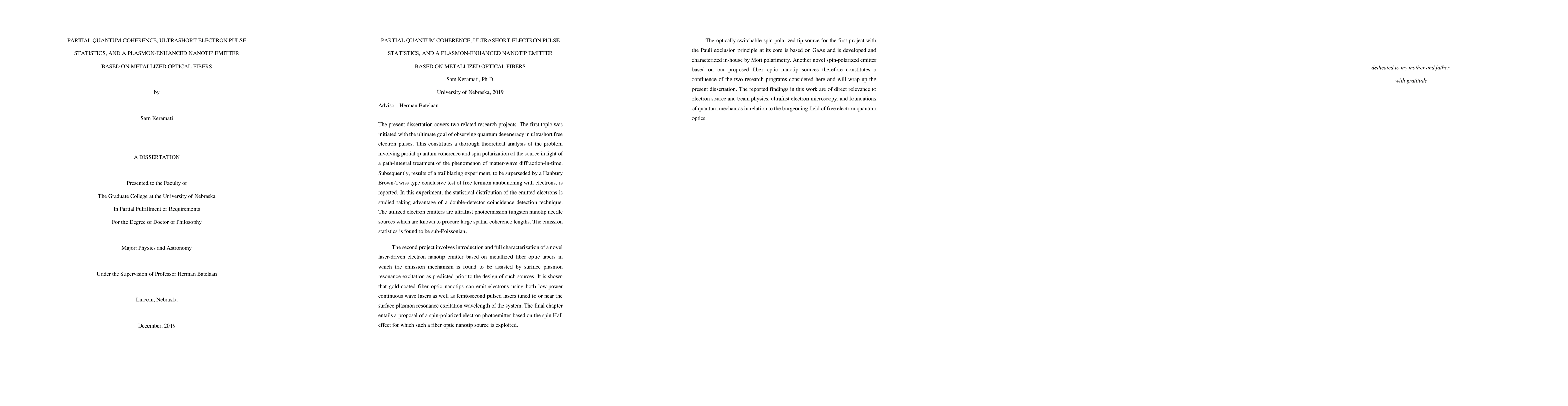 This paper explores two projects: one investigates partial quantum coherence and spin polarization in ultrashort free electron pulses, revealing sub-Poissonian emission statistics via a double-detector technique. The second project introduces a novel plasmon-enhanced electron emitter based on metallized optical fibers, demonstrating effective electron emission using both continuous wave and femtosecond pulsed lasers.