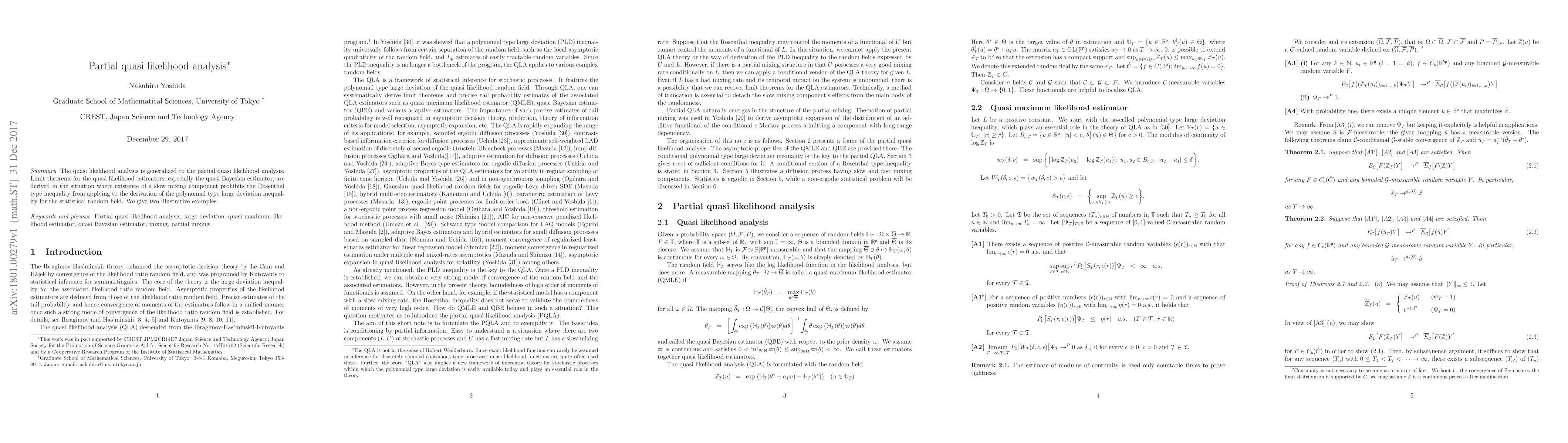 The quasi likelihood analysis is generalized to the partial quasi likelihood analysis. Limit theorems for the quasi likelihood estimators, especially the quasi Bayesian estimator, are derived in the situation where existence of a slow mixing component prohibits the Rosenthal type inequality from applying to the derivation of the polynomial type large deviation inequality for the statistical random field. We give two illustrative examples.