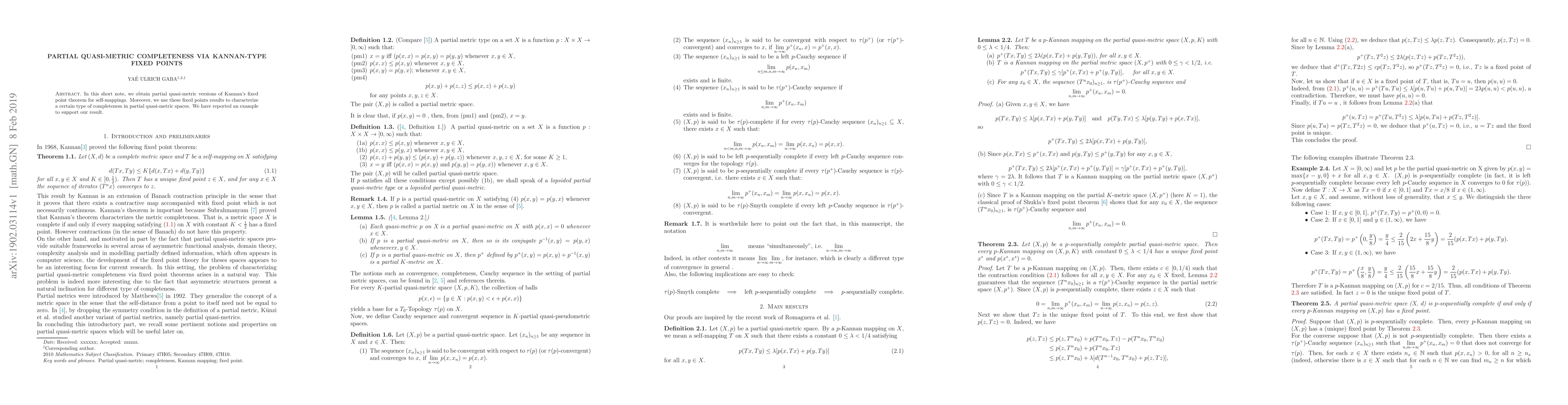 This paper establishes partial quasi-metric versions of Kannan's fixed point theorem for self-mappings and utilizes these results to define and characterize a specific type of completeness in partial quasi-metric spaces, supported by an illustrative example.