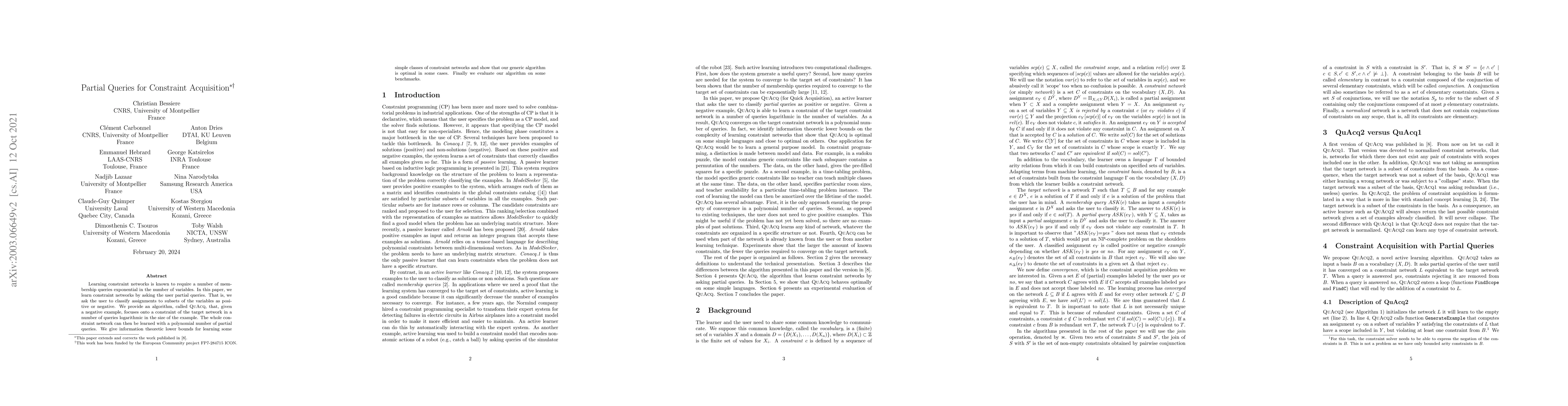 This paper proposes an algorithm, QUACQ, for learning constraint networks through partial queries, requiring logarithmic queries per negative example and polynomial queries overall, significantly reducing the number of queries compared to traditional methods. The authors also establish information-theoretic lower bounds and demonstrate the algorithm's optimality for certain constraint networks.