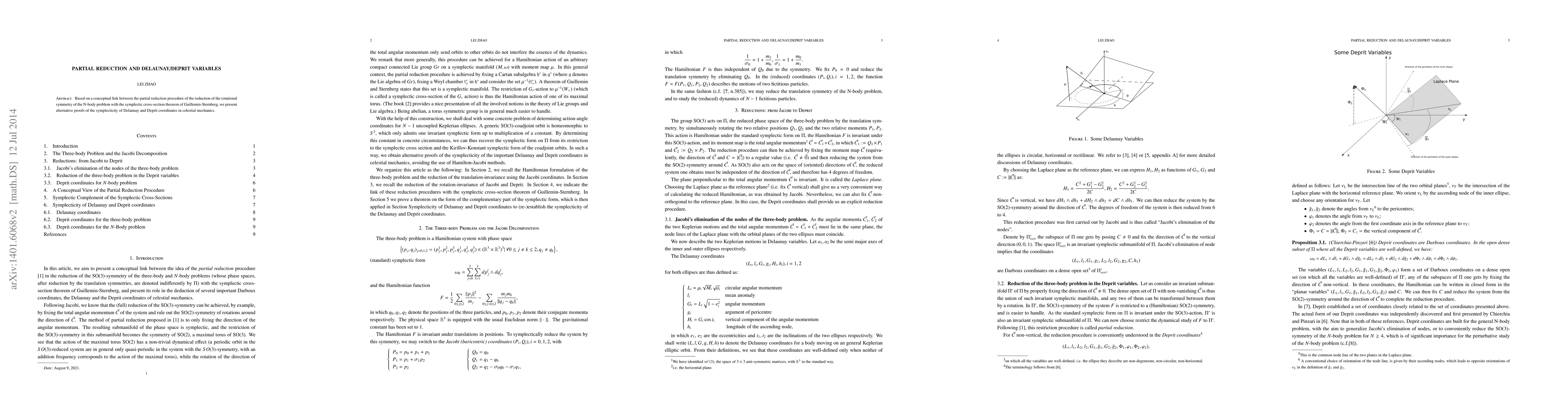 Based on a concept link between the partial reduction procedure of the reduction of the rotational symmetry of the N-body problem with the symplectic cross-section theorem of Guillemin-Sternberg, we present alternative proofs of the symplecticity of Delaunay and Deprit coordinates in celestial mechanics.