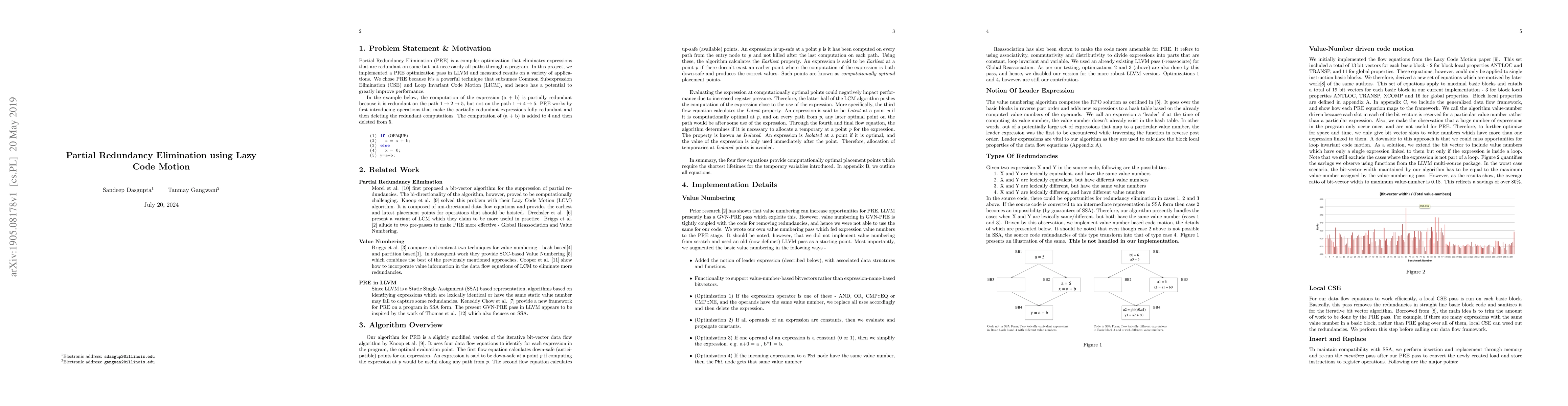 This paper presents a PRE optimization pass implemented in LLVM to eliminate redundant expressions in some but not all program paths, subsuming CSE and LICM for potential performance gains. Results from various applications demonstrate the effectiveness of this optimization technique.