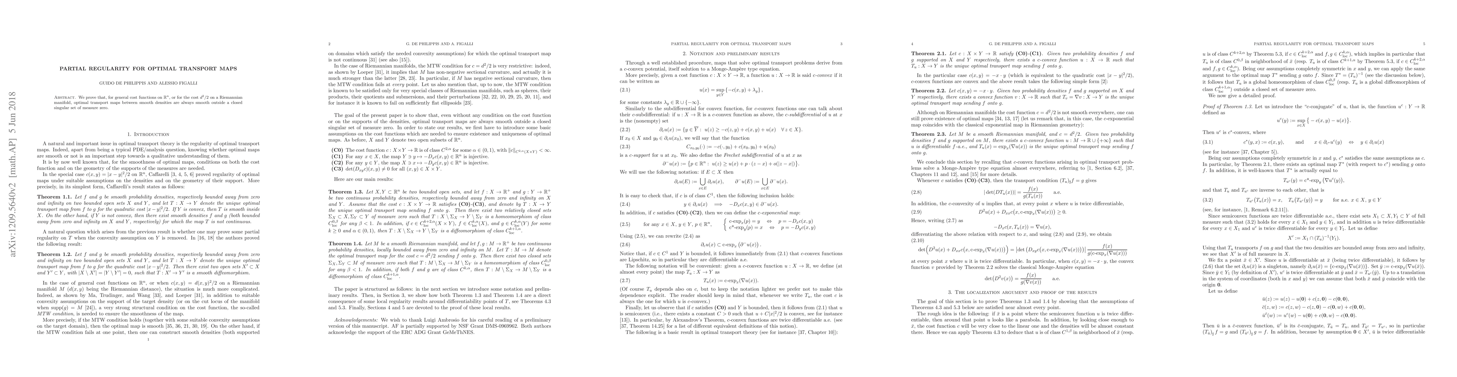 This paper establishes that optimal transport maps, under general cost functions or the quadratic cost on a Riemannian manifold, are smooth except for a singular set of measure zero, demonstrating partial regularity.