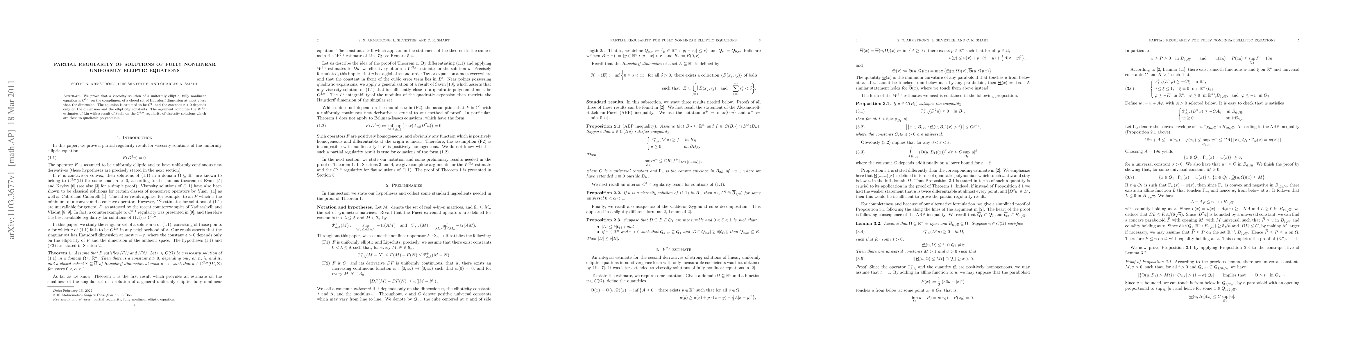 Summary: The paper proves that viscosity solutions of uniformly elliptic, fully nonlinear equations exhibit $C^{2,\alpha}$ regularity outside a closed set of lower Hausdorff dimension, leveraging $W^{2,\epsilon}$ estimates and Savin's results on solutions close to quadratic polynomials. The regularity's dependence on dimension and ellipticity constants is highlighted.