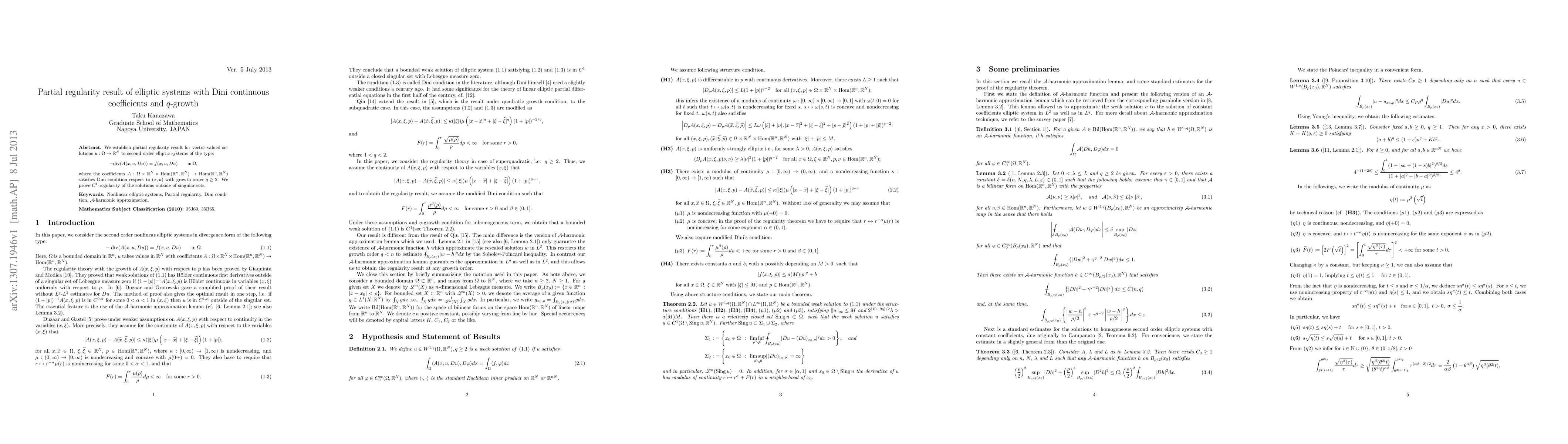This paper establishes a partial regularity result for vector-valued solutions to second-order elliptic systems with Dini continuous coefficients and $q$-growth, proving $C^1$-regularity outside a singular set. The coefficients satisfy a Dini condition with growth order greater than 2.