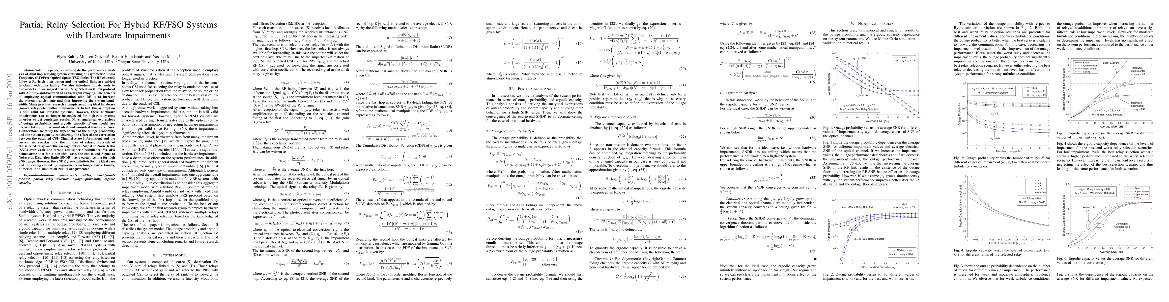 In this paper, we investigate the performance analysis of dual hop relaying system consisting of asymmetric Radio Frequency (RF)/Free Optical Space (FSO) links. The RF channels follow a Rayleigh distribution and the optical links are subject to Gamma-Gamma fading. We also introduce impairments to our model and we suggest Partial Relay Selection (PRS) protocol with Amplify-and-Forward (AF) fixed gain relaying. The benefits of employing optical communication with RF, is to increase the system transfer rate and thus improving the system bandwidth. Many previous research attempts assuming ideal hardware (source, relays, etc.) without impairments. In fact, this assumption is still valid for low-rate systems. However, these hardware impairments can no longer be neglected for high-rate systems in order to get consistent results. Novel analytical expressions of outage probability and ergodic capacity of our model are derived taking into account ideal and non-ideal hardware cases. Furthermore, we study the dependence of the outage probability and the system capacity considering, the effect of the correlation between the outdated CSI (Channel State Information) and the current source-relay link, the number of relays, the rank of the selected relay and the average optical Signal to Noise Ratio (SNR) over weak and strong atmospheric turbulence. We also demonstrate that for a non-ideal case, the end-to-end Signal to Noise plus Distortion Ratio (SNDR) has a certain ceiling for high SNR range. However, the SNDR grows infinitely for the ideal case and the ceiling caused by impairments no longer exists. Finally, numerical and simulation results are presented.