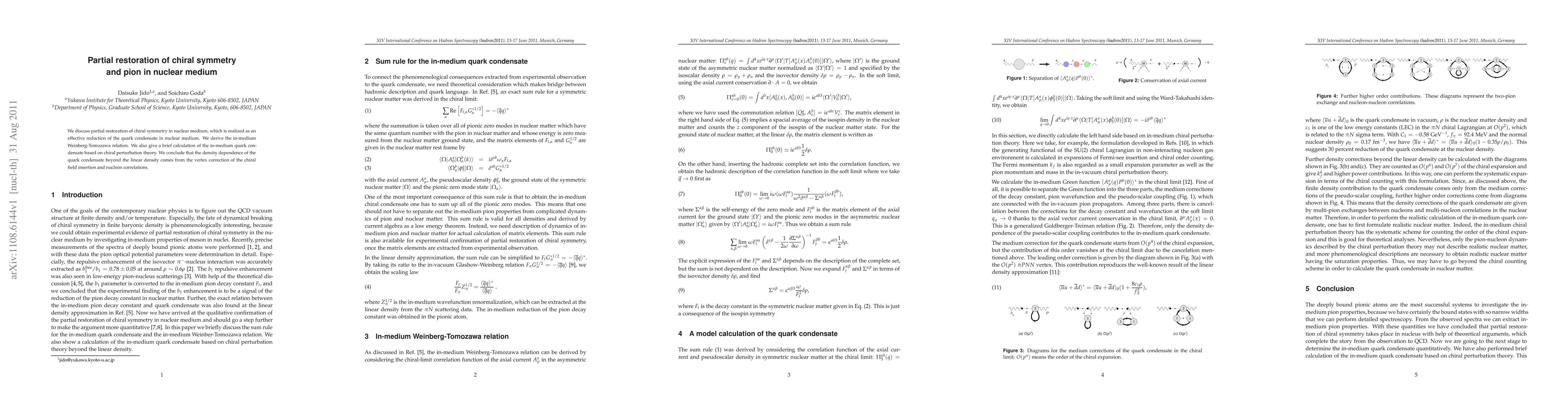 This paper explores the partial restoration of chiral symmetry in nuclear medium, showing a reduction in the quark condensate. It derives the in-medium Weinberg-Tomozawa relation and calculates the in-medium quark condensate using chiral perturbation theory, concluding that non-linear density effects arise from chiral field vertex corrections and nucleon correlations.