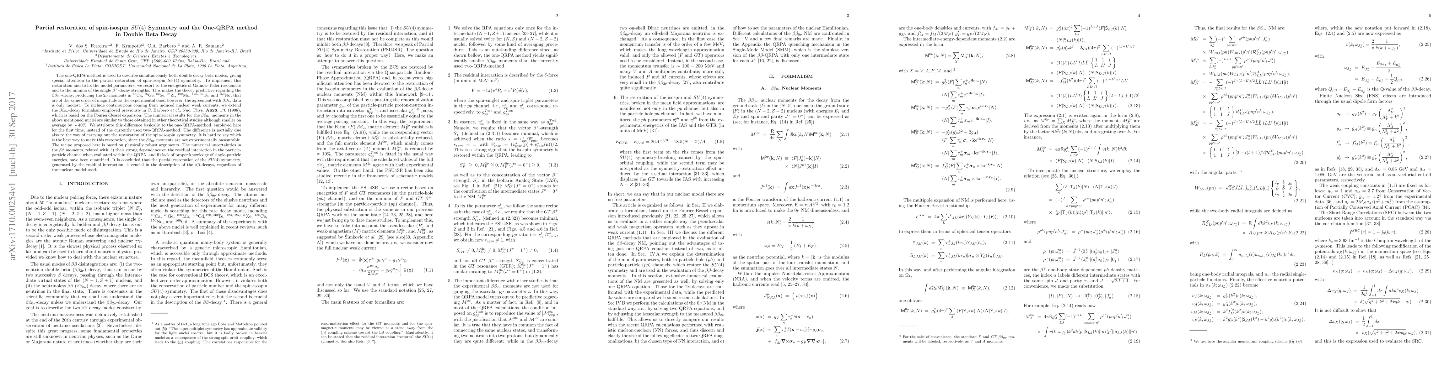 The one-QRPA method is used to describe simultaneously both double decay beta modes, giving special attention to the partial restoration of spin-isospin SU(4) symmetry. To implement this restoration and to fix the model parameters, we resort to the energetics of Gamow-Teller resonances and to the minima of the single $\beta^+$-decay strengths. This makes the theory predictive regarding the $\beta\beta_{2\nu}$-decay, producing the $2\nu$ moments in $^{48}$Ca, $^{76}$Ge, $^{82}$Se, $^{96}$Zr, $^{100}$Mo, $^{128,130}$Te, and $^{150}$Nd, that are of the same order of magnitude as the experimental ones; however, the agreement with $\beta\beta_{2\nu}$ data is only modest. To include contributions coming from induced nuclear weak currents, we extend the $\beta\beta_{0\nu}$-decay formalism employed previously in C. Barbero et. al, Nuc. Phys. A628, 170 (1998). The numerical results for the $\beta\beta_{0\nu}$ moments in the above mentioned nuclei are similar to those obtained in other theoretical studies although smaller on averag by $\sim 40\%$. We attribute this difference basically to the one-QRPA-method, employed here for the first time, instead of the currently used two-QRPA-method. The difference is partially due to the way of carrying out the restoration of the spin-isospin symmetry. It is hard to say which is the best way to make the restoration, since the $\beta\beta_{0\nu}$ moments are not experimentally measurable. The numerical uncertainties in the $\beta\beta$ moments, related with i) their strong dependence on the residual interaction in the p-p channel when evaluated within the QRPA, and ii) lack of proper knowledge of single-particle energies, have been quantified. It is concluded that the partial restoration of the SU (4) symmetry is crucial in the description of the $\beta\beta$-decays, regardless of the nuclear model used.