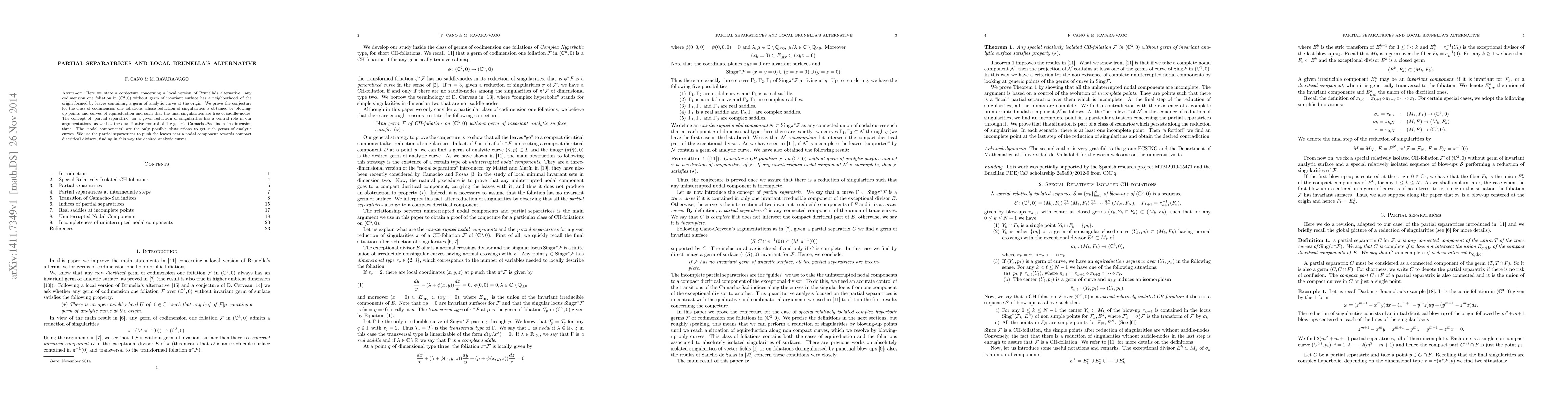 Here we state a conjecture concerning a local version of Brunella's alternative: any codimension one foliation in $({\mathbb C}^3,0)$ without germ of invariant surface has a neighborhood of the origin formed by leaves containing a germ of analytic curve at the origin. We prove the conjecture for the class of codimension one foliations whose reduction of singularities is obtained by blowing-up points and curves of equireduction and such that the final singularities are free of saddle-nodes. The concept of "partial separatrix" for a given reduction of singularities has a central role in our argumentations, as well as the quantitative control of the generic Camacho-Sad index in dimension three. The "nodal components" are the only possible obstructions to get such germs of analytic curves. We use the partial separatrices to push the leaves near a nodal component towards compact diacritical divisors, finding in this way the desired analytic curves.