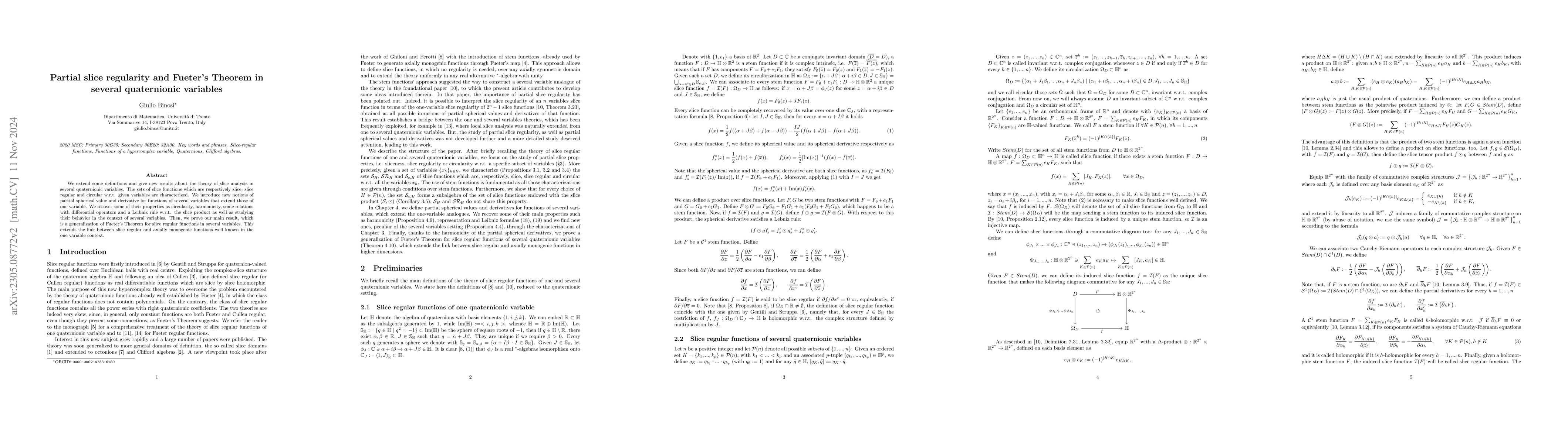 This paper extends slice analysis to several quaternionic variables, introducing partial spherical values and derivatives. It generalizes Fueter's Theorem and characterizes slice, slice regular, and circular slice functions in this context.
