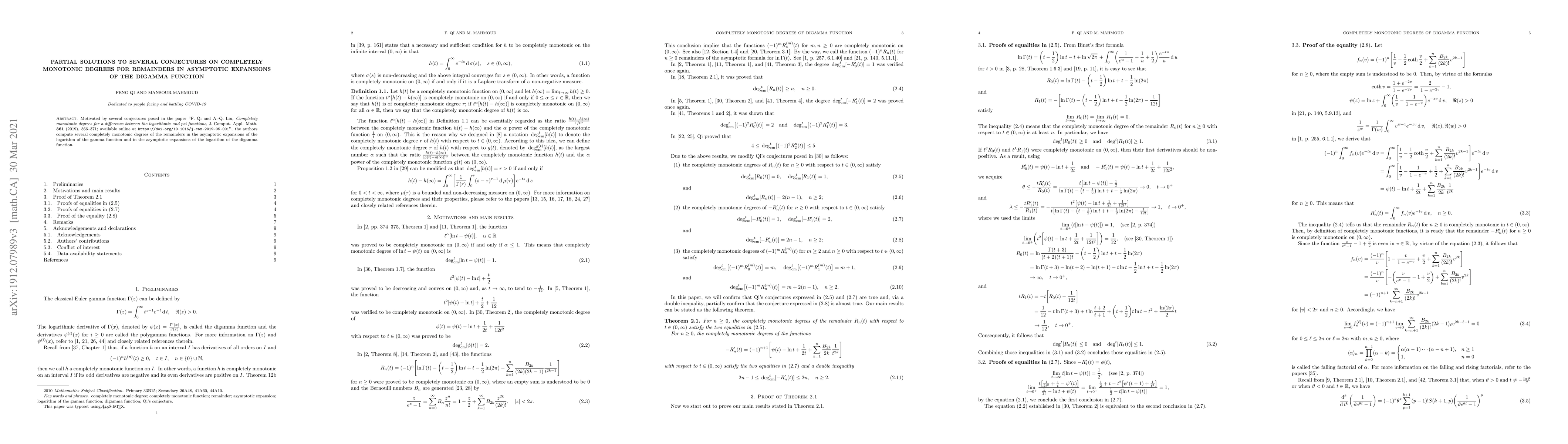 This paper addresses conjectures regarding the completely monotonic degrees of remainders in the asymptotic expansions of the digamma function, providing partial solutions and computations based on prior work by Qi and Liu.