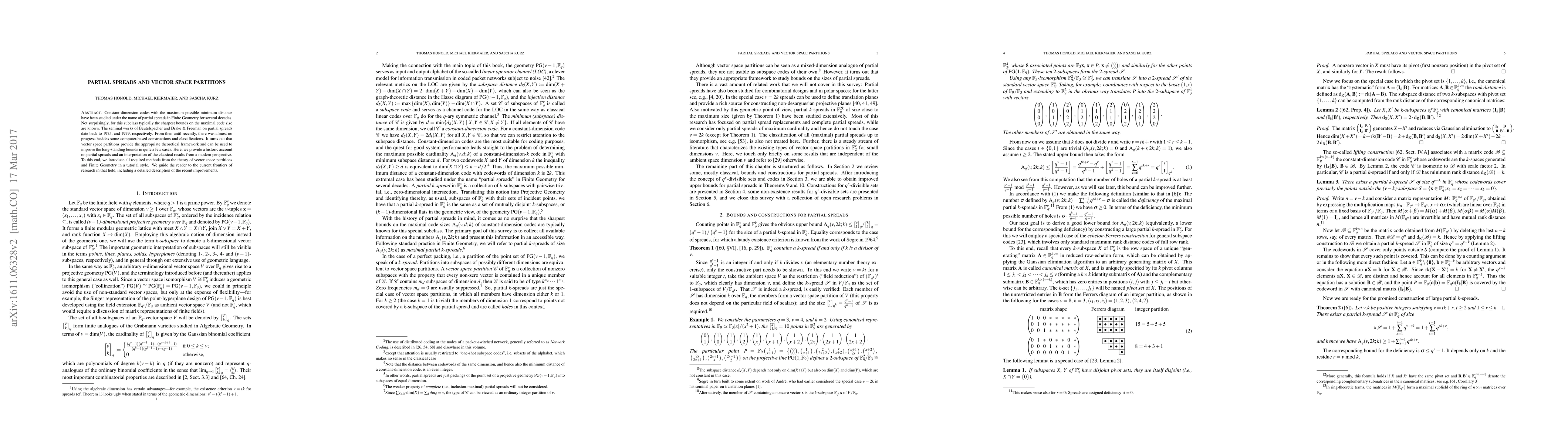 This paper reviews the historical development and recent advancements in the study of partial spreads—constant-dimension codes with maximal minimum distance—within Finite Geometry, employing vector space partitions to enhance existing bounds. It provides a comprehensive tutorial on the necessary theoretical methods and highlights recent improvements in the field.