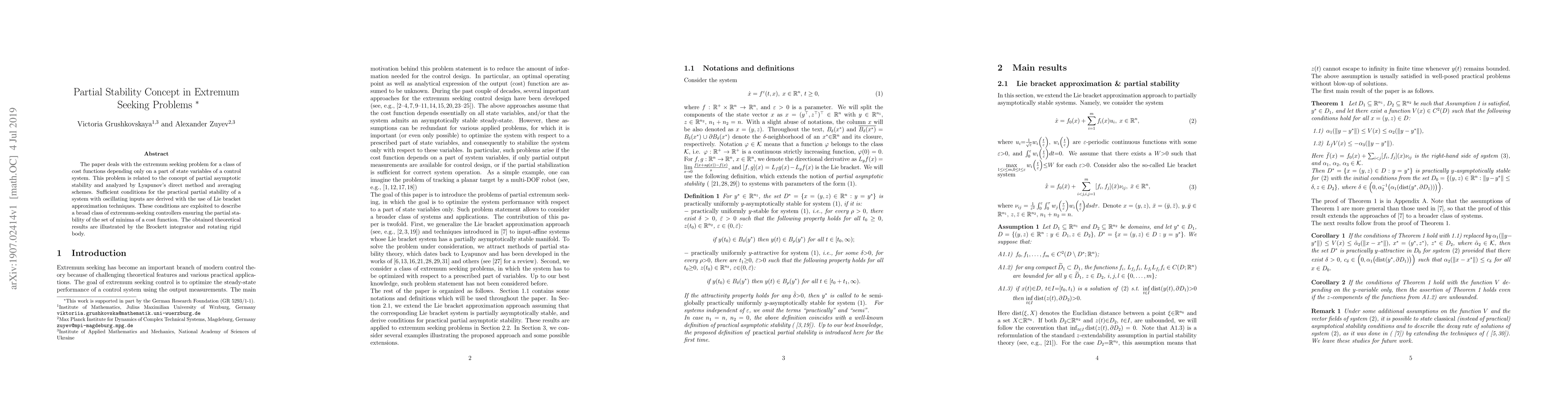 The paper deals with the extremum seeking problem for a class of cost functions depending only on a part of state variables of a control system. This problem is related to the concept of partial asymptotic stability and analyzed by Lyapunov's direct method and averaging schemes. Sufficient conditions for the practical partial stability of a system with oscillating inputs are derived with the use of Lie bracket approximation techniques. These conditions are exploited to describe a broad class of extremum-seeking controllers ensuring the partial stability of the set of minima of a cost function. The obtained theoretical results are illustrated by the Brockett integrator and rotating rigid body.