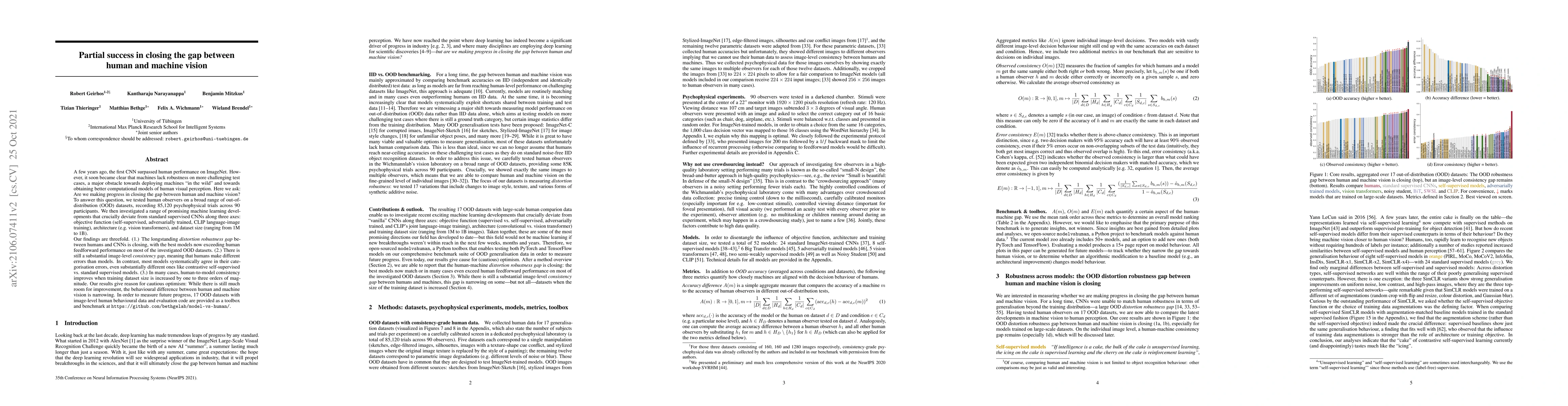 This paper investigates the progress in closing the gap between human and machine vision, finding that while the robustness gap is narrowing, there remains a significant consistency gap. The study concludes with cautious optimism, noting improvements with larger training datasets and providing a toolbox of 17 OOD datasets for future benchmarking.
