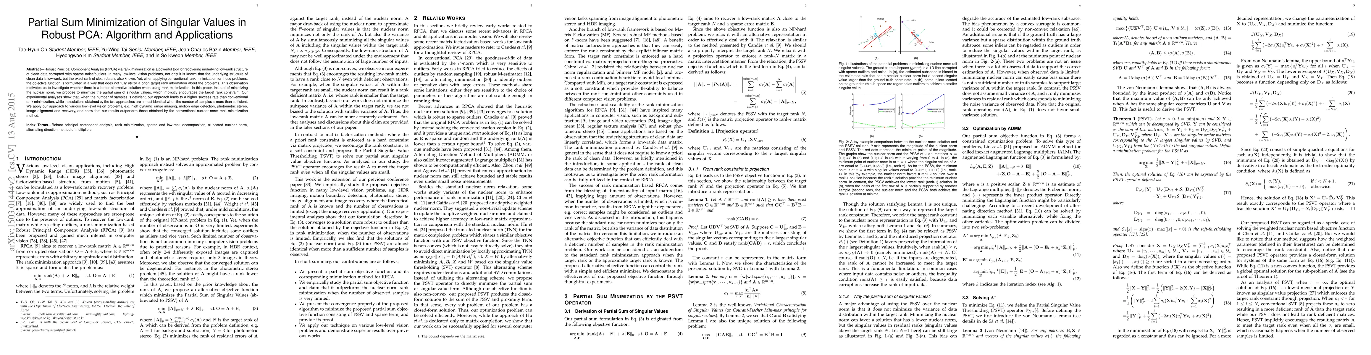Robust Principal Component Analysis (RPCA) via rank minimization is a powerful tool for recovering underlying low-rank structure of clean data corrupted with sparse noise/outliers. In many low-level vision problems, not only it is known that the underlying structure of clean data is low-rank, but the exact rank of clean data is also known. Yet, when applying conventional rank minimization for those problems, the objective function is formulated in a way that does not fully utilize a priori target rank information about the problems. This observation motivates us to investigate whether there is a better alternative solution when using rank minimization. In this paper, instead of minimizing the nuclear norm, we propose to minimize the partial sum of singular values, which implicitly encourages the target rank constraint. Our experimental analyses show that, when the number of samples is deficient, our approach leads to a higher success rate than conventional rank minimization, while the solutions obtained by the two approaches are almost identical when the number of samples is more than sufficient. We apply our approach to various low-level vision problems, e.g. high dynamic range imaging, motion edge detection, photometric stereo, image alignment and recovery, and show that our results outperform those obtained by the conventional nuclear norm rank minimization method.