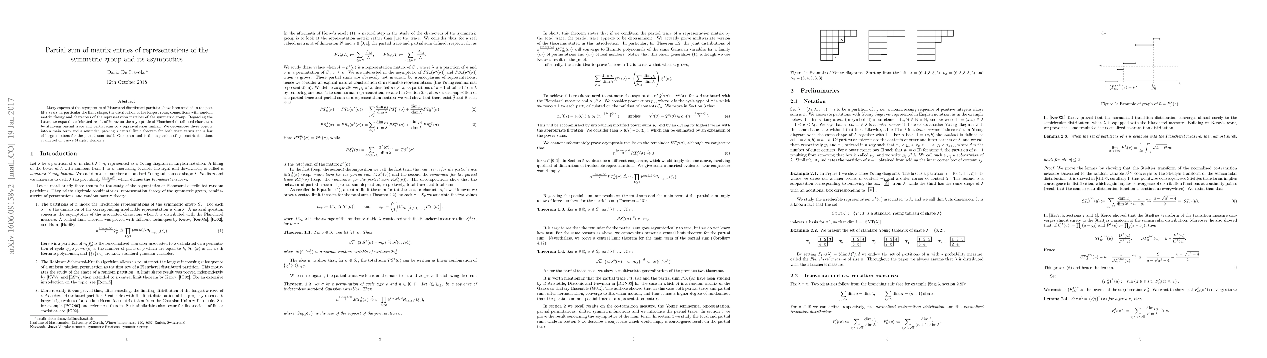 Many aspects of the asymptotics of Plancherel distributed partitions have been studied in the past fifty years, in particular the limit shape, the distribution of the longest rows, connections with random matrix theory and characters of the representation matrices of the symmetric group. Regarding the latter, we expand a celebrated result of Kerov on the asymptotic of Plancherel distributed characters by studying partial trace and partial sum of a representation matrix. We decompose these objects into a main term and a reminder, proving a central limit theorem for both main terms and a law of large numbers for the partial sum itself. Our main tool is the expansion of symmetric functions evaluated on Jucys-Murphy elements.