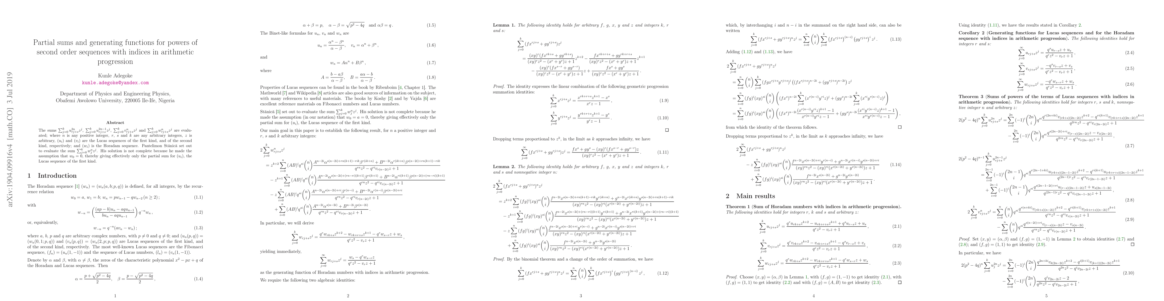 This paper evaluates partial sums involving powers of second-order sequences, specifically Lucas and Horadam sequences, with indices in arithmetic progression. It addresses the limitations of previous work by Pantelimon Stănică, who did not fully account for the Horadam sequence due to an assumption of $w_0=0$.