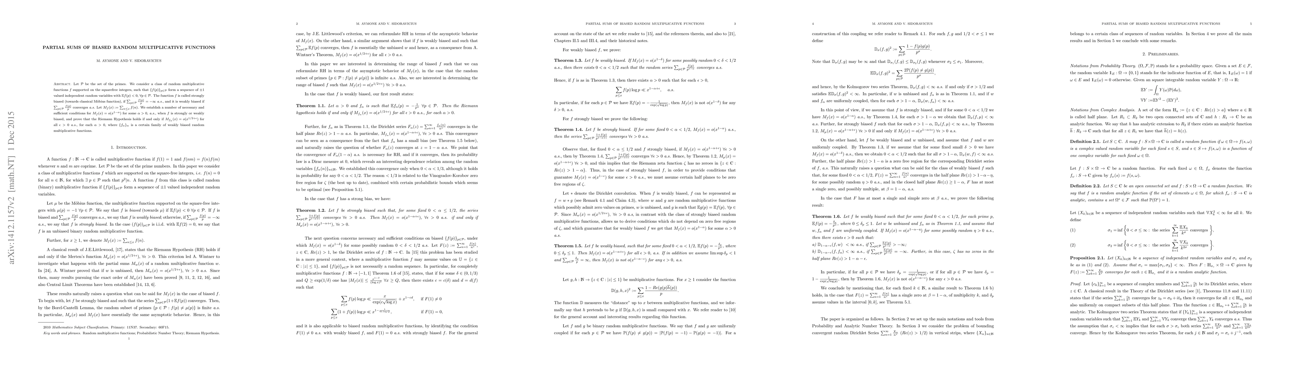 The paper studies biased random multiplicative functions and their partial sums, establishing conditions for these sums to behave in a certain way, with implications for the Riemann Hypothesis.