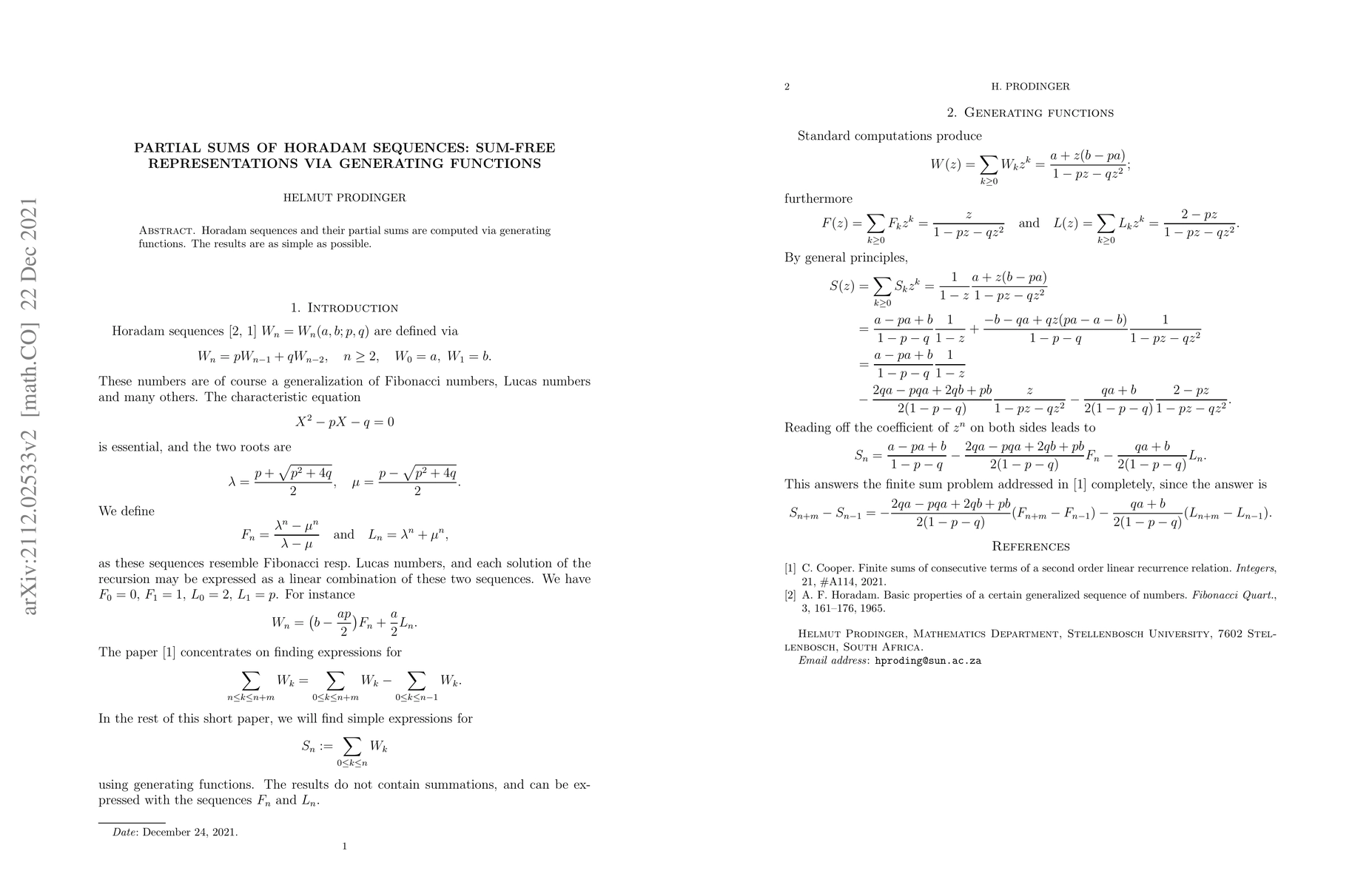 Summary: This paper explores Horadam sequences and their partial sums using generating functions, achieving simple and elegant sum-free representations of these sequences.