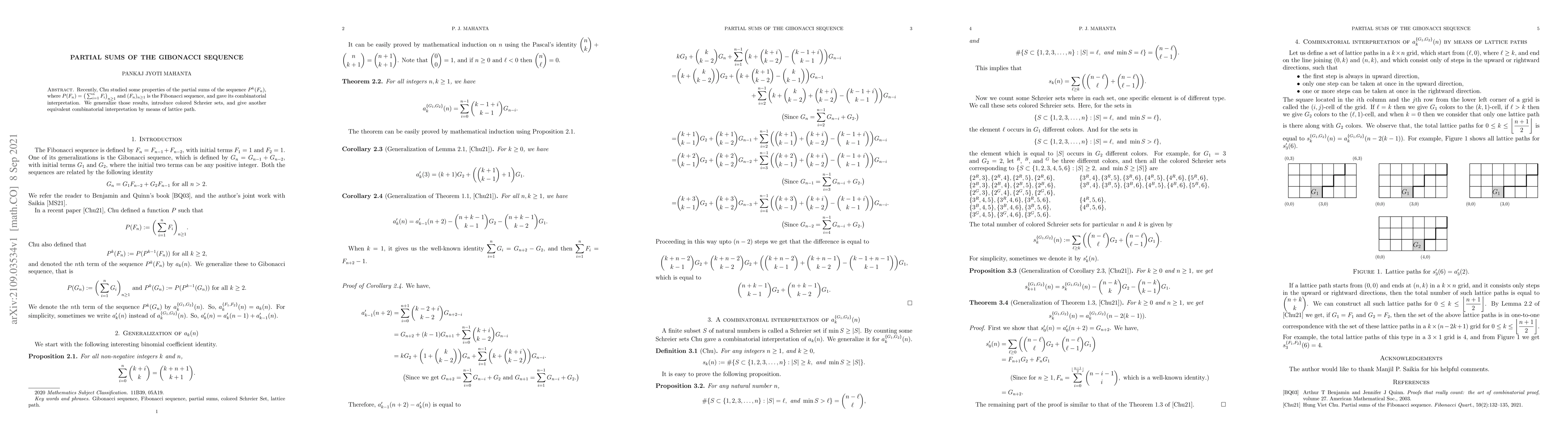 Recently, Chu studied some properties of the partial sums of the sequence $P^k(F_n)$, where $P(F_n)=\big(\sum_{i=1}^nF_i\big)_{n\geq1}$ and $(F_n)_{n\geq1}$ is the Fibonacci sequence, and gave its combinatorial interpretation. We generalize those results, introduce colored Schreier sets, and give another equivalent combinatorial interpretation by means of lattice path.