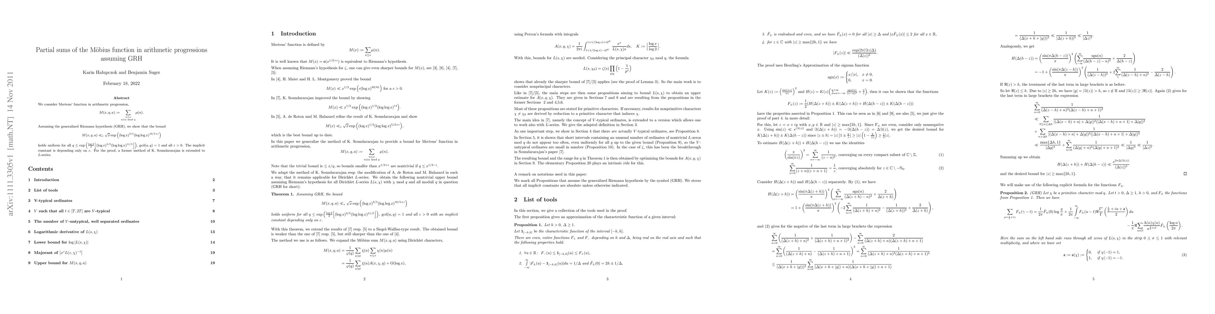 We consider Mertens' function M(x,q,a) in arithmetic progression, Assuming the generalized Riemann hypothesis (GRH), we show an upper bound that is uniform for all moduli which are not too large. For the proof, a former method of K. Soundararajan is extended to L-series.