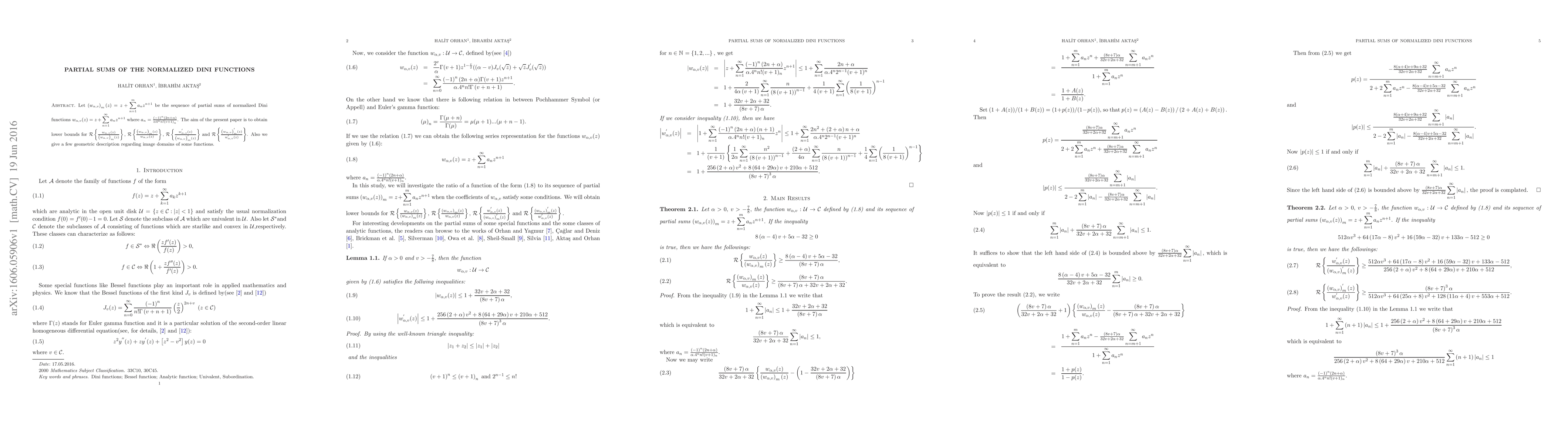 This paper investigates the partial sums of normalized Dini functions and aims to derive lower bounds for specific ratios involving these functions and their derivatives. It also provides geometric descriptions of the image domains of certain related functions.