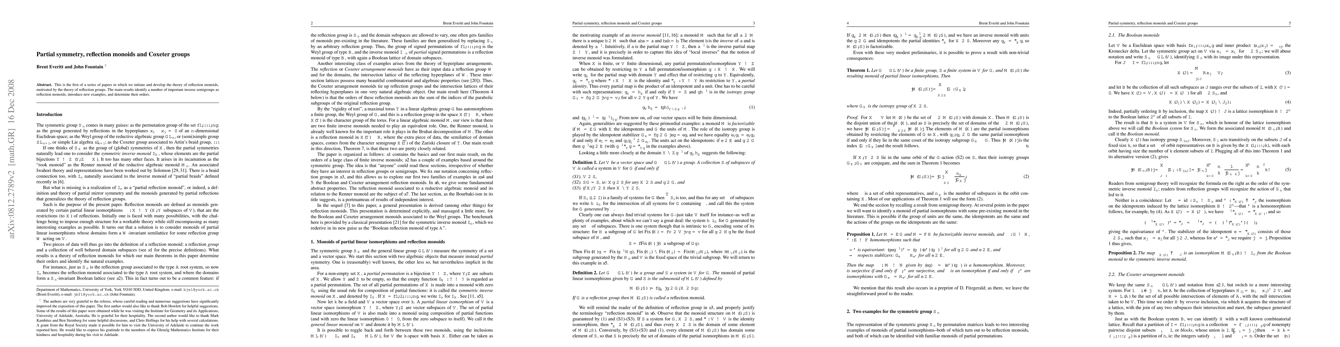 This is the first of a series of papers in which we initiate and develop the theory of reflection monoids, motivated by the theory of reflection groups. The main results identify a number of important inverse semigroups as reflection monoids, introduce new examples, and determine their orders.