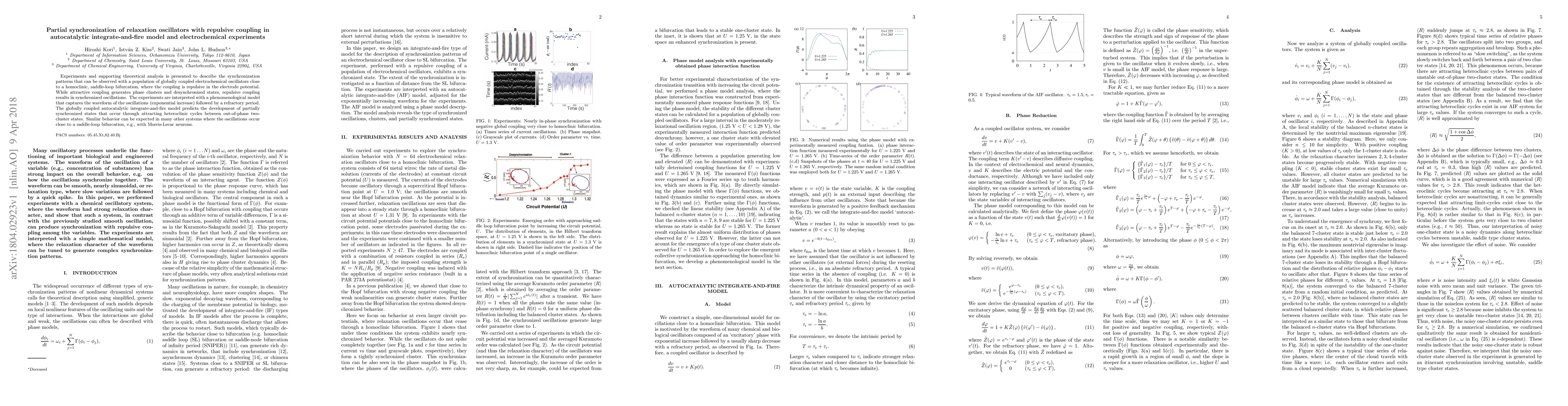 Experiments and supporting theoretical analysis is presented to describe the synchronization patterns that can be observed with a population of globally coupled electrochemical oscillators close to a homoclinic, saddle-loop bifurcation, where the coupling is repulsive in the electrode potential. While attractive coupling generates phase clusters and desynchronized states, repulsive coupling results in synchronized oscillations. The experiments are interpreted with a phenomenological model that captures the waveform of the oscillations (exponential increase) followed by a refractory period. The globally coupled autocatalytic integrate-and-fire model predicts the development of partially synchronized states that occur through attracting heteroclinic cycles between out-of-phase two-cluster states. Similar behavior can be expected in many other systems where the oscillations occur close to a saddle-loop bifurcation, e.g., with Morris-Lecar neurons.