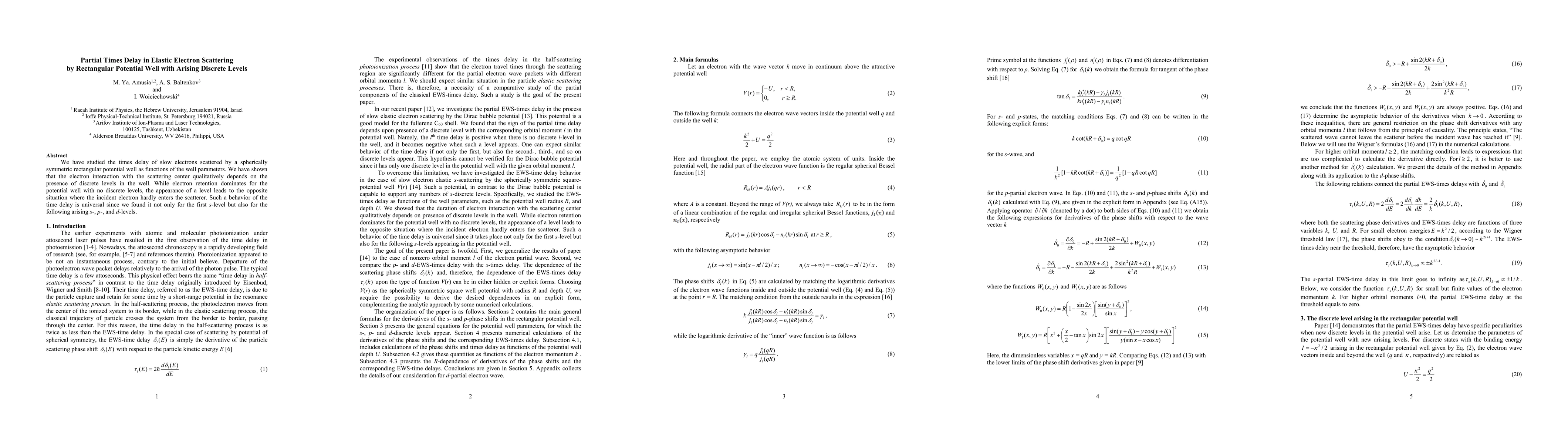 The paper investigates how a rectangular potential well with discrete levels affects electron scattering, finding that electron retention decreases as more levels appear, while time delay increases.