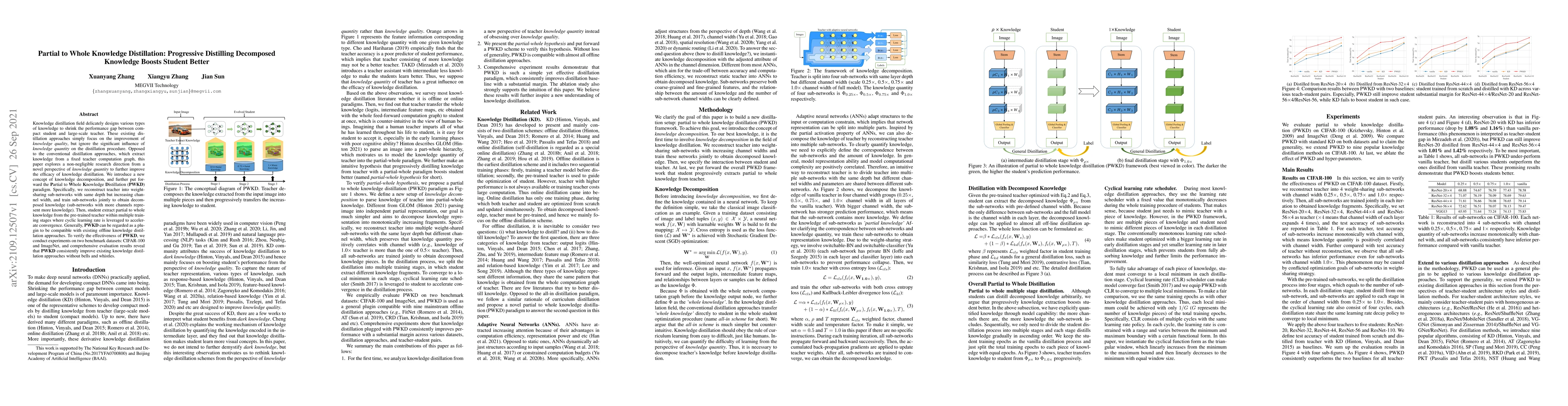 This paper introduces a novel Partial to Whole Knowledge Distillation (PWKD) paradigm that focuses on both knowledge quality and quantity to enhance knowledge distillation. PWKD reconstructs a teacher model into weight-sharing sub-networks with increasing channel width, distilling decomposed knowledge in multiple training stages, and consistently improves existing distillation methods on CIFAR-100 and ImageNet datasets.
