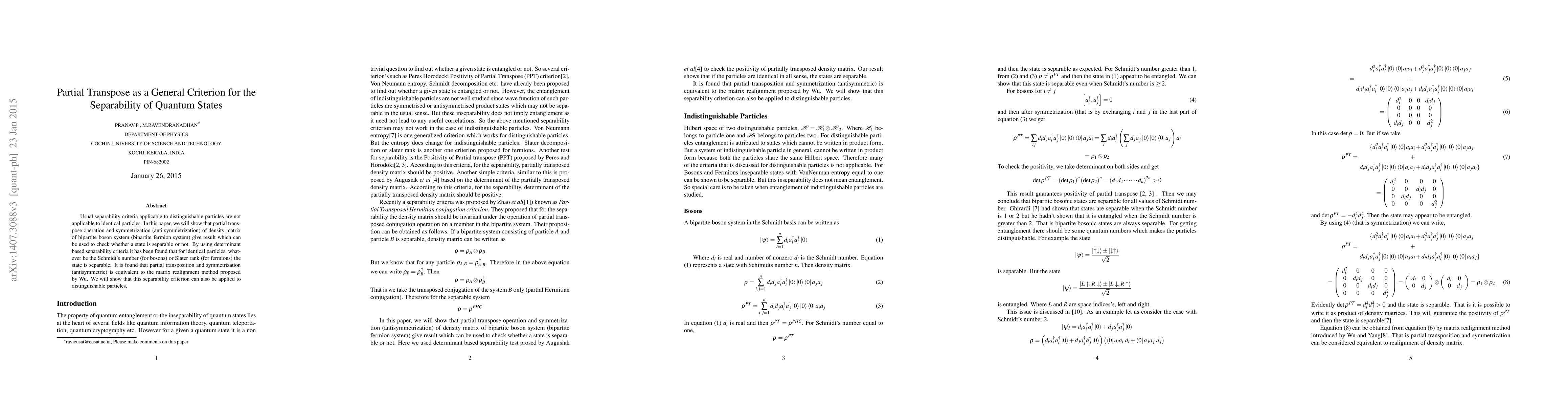 This paper proposes partial transposition and symmetrization (or anti-symmetrization) as a new separability criterion for quantum states of identical particles, demonstrating that bipartite states of bosons and fermions are always separable. It also shows equivalence between this method and the realignment criteria introduced by Wu.