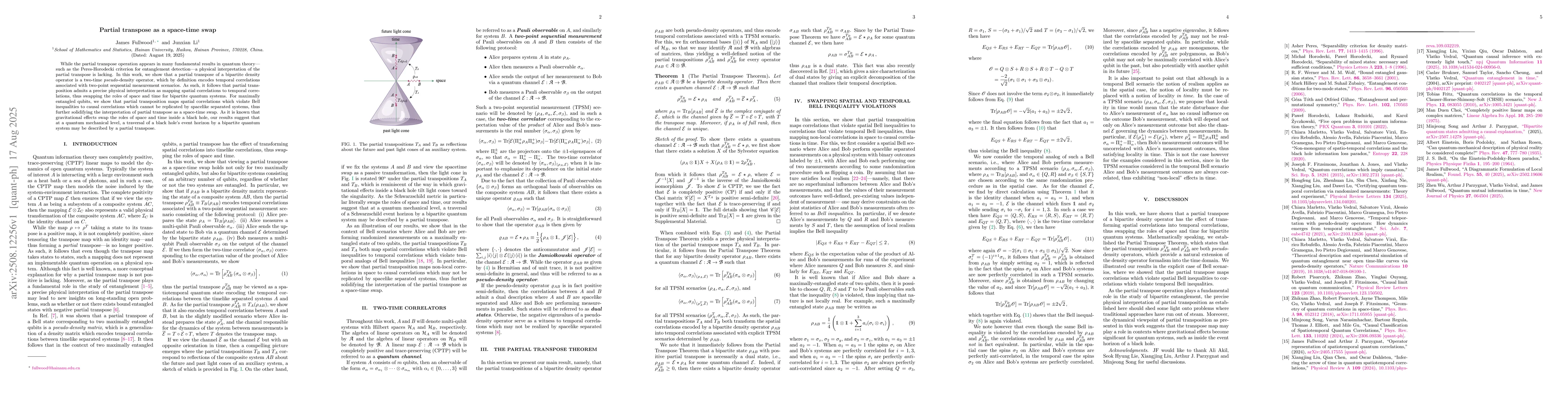 While the partial transpose operation appears in many fundamental results in quantum theory -- such as the Peres-Horodecki criterion for entanglement detection -- a physical interpretation of the partial transpose is lacking. In this work, we show that a partial transpose of a bipartite density operator is a two-time pseudo-density operator, which by definition encodes temporal correlations associated with two-point sequential measurement scenarios. As such, it follows that partial transposition admits a precise physical interpretation as mapping spatial correlations to temporal correlations, thus swapping the roles of space and time for bipartite quantum systems. For maximally entangled qubits, we show that partial transposition maps spatial correlations which violate Bell inequalities to causal correlations which cannot be replicated by spacelike separated systems, thus further solidifying the interpretation of partial transpose as a space-time swap. As it is known that gravitational effects swap the roles of space and time inside a black hole, our results suggest that at a quantum mechanical level, a traversal of a black hole's event horizon by a bipartite quantum system may be described by a partial transpose.