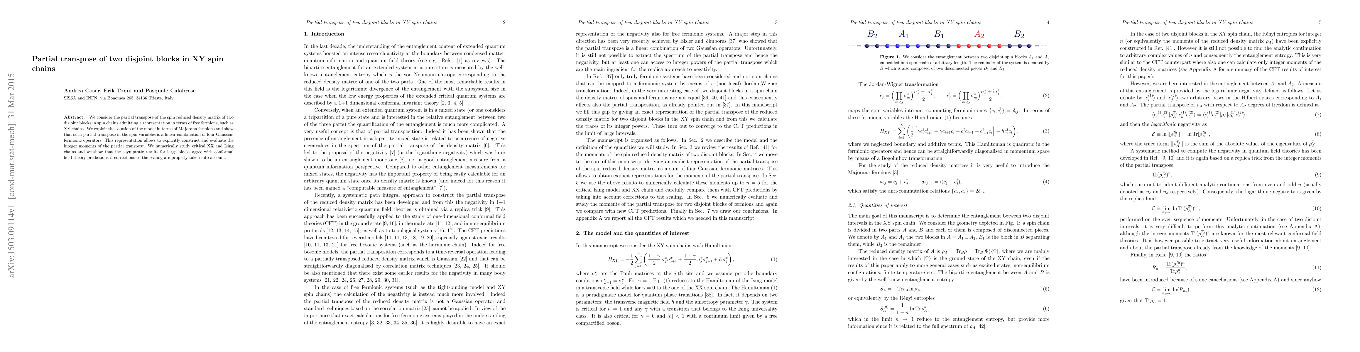 This paper investigates the partial transpose of the spin reduced density matrix for two disjoint blocks in XY spin chains, represented by Majorana fermions. The study reveals that the partial transpose is a linear combination of Gaussian fermionic operators, enabling the evaluation of integer moments and confirming conformal field theory predictions for critical XX and Ising chains.