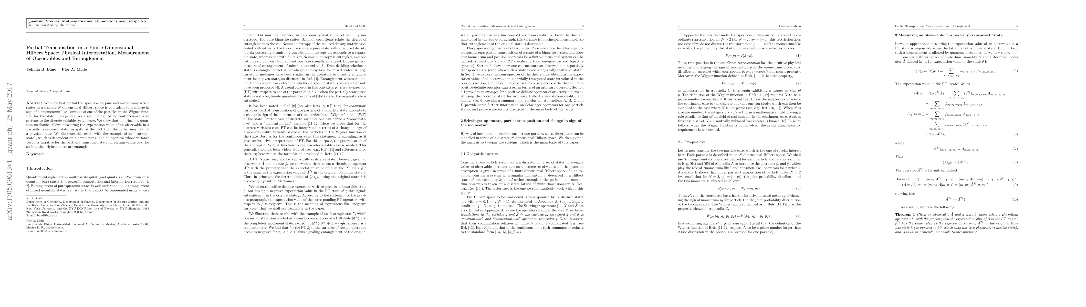 We show that partial transposition for pure and mixed two-particle states in a discrete $N$-dimensional Hilbert space is equivalent to a change in sign of a "momentum-like" variable of one of the particles in the Wigner function for the state. This generalizes a result obtained for continuous-variable systems to the discrete-variable system case. We show that, in principle, quantum mechanics allows measuring the expectation value of an observable in a partially transposed state, in spite of the fact that the latter may not be a physical state. We illustrate this result with the example of an "isotropic state", which is dependent on a parameter $r$, and an operator whose variance becomes negative for the partially transposed state for certain values of $r$; for such $r$, the original states are entangled.