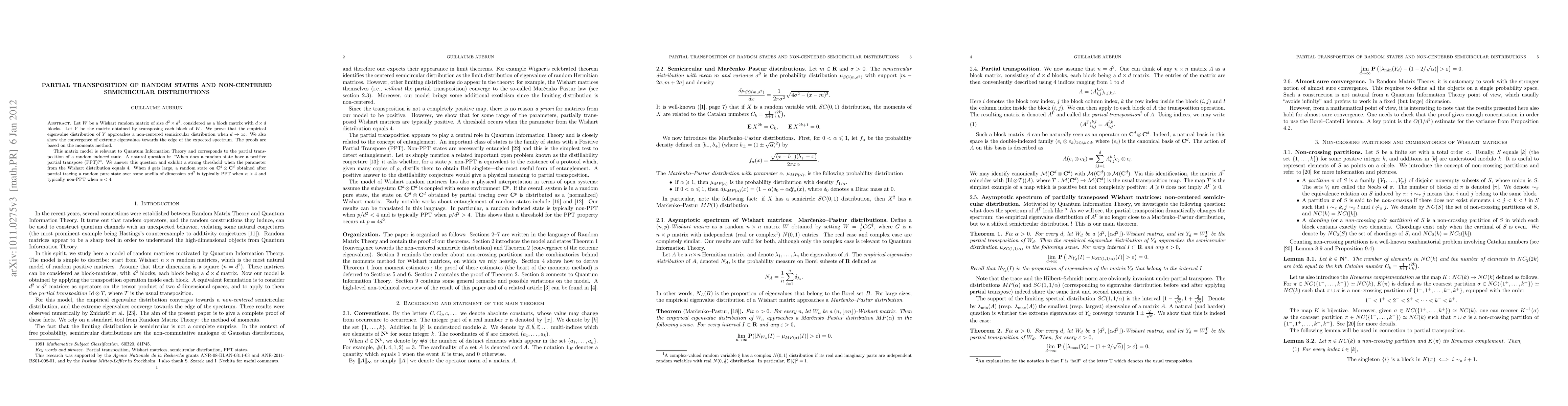 This paper investigates the eigenvalue distribution of the partially transposed Wishart random matrix, showing it converges to a non-centered semicircular distribution as the dimension increases. It also addresses the positivity of partial transposes in quantum states, revealing a critical threshold at 4 for the dimension-independent parameter.