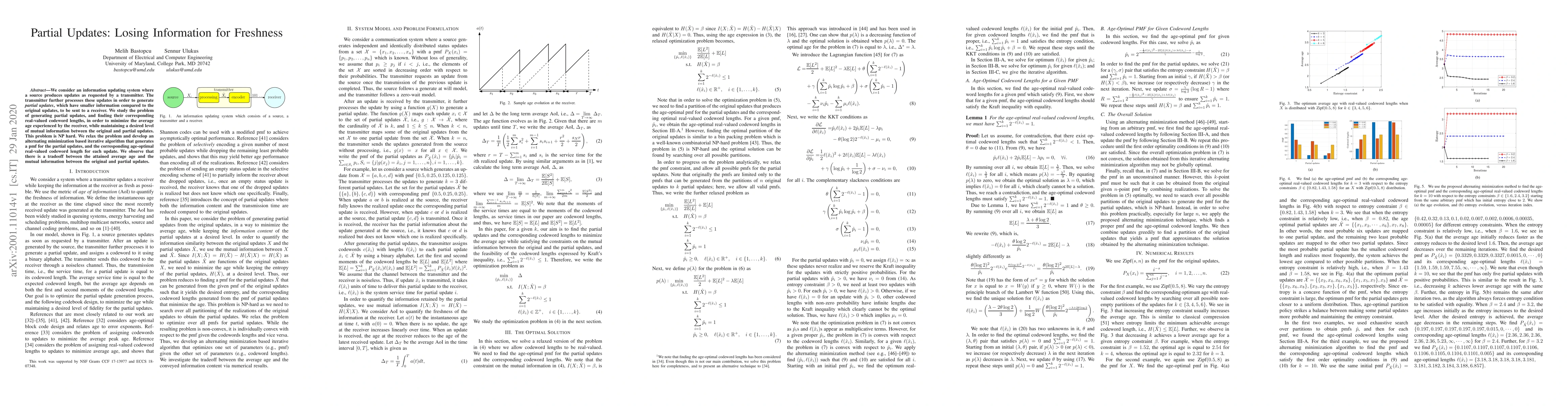 We consider an information updating system where a source produces updates as requested by a transmitter. The transmitter further processes these updates in order to generate $partial$ $updates$, which have smaller information compared to the original updates, to be sent to a receiver. We study the problem of generating partial updates, and finding their corresponding real-valued codeword lengths, in order to minimize the average age experienced by the receiver, while maintaining a desired level of mutual information between the original and partial updates. This problem is NP hard. We relax the problem and develop an alternating minimization based iterative algorithm that generates a pmf for the partial updates, and the corresponding age-optimal real-valued codeword length for each update. We observe that there is a tradeoff between the attained average age and the mutual information between the original and partial updates.