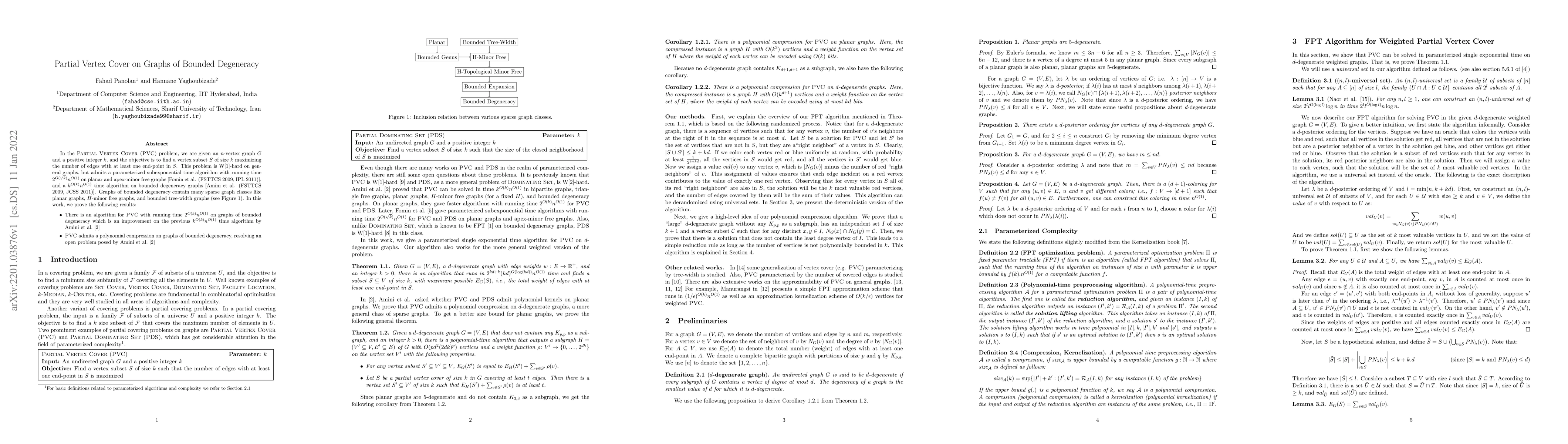 In the Partial Vertex Cover (PVC) problem, we are given an $n$-vertex graph $G$ and a positive integer $k$, and the objective is to find a vertex subset $S$ of size $k$ maximizing the number of edges with at least one end-point in $S$. This problem is W[1]-hard on general graphs, but admits a parameterized subexponential time algorithm with running time $2^{O(\sqrt{k})}n^{O(1)}$ on planar and apex-minor free graphs [Fomin et al. (FSTTCS 2009, IPL 2011)], and a $k^{O(k)}n^{O(1)}$ time algorithm on bounded degeneracy graphs [Amini et al. (FSTTCS 2009, JCSS 2011)]. Graphs of bounded degeneracy contain many sparse graph classes like planar graphs, $H$-minor free graphs, and bounded tree-width graphs. In this work, we prove the following results: 1) There is an algorithm for PVC with running time $2^{O(k)}n^{O(1)}$ on graphs of bounded degeneracy which is an improvement on the previous $k^{O(k)}n^{O(1)}$ time algorithm by Amini et al. 2) PVC admits a polynomial compression on graphs of bounded degeneracy, resolving an open problem posed by Amini et al.