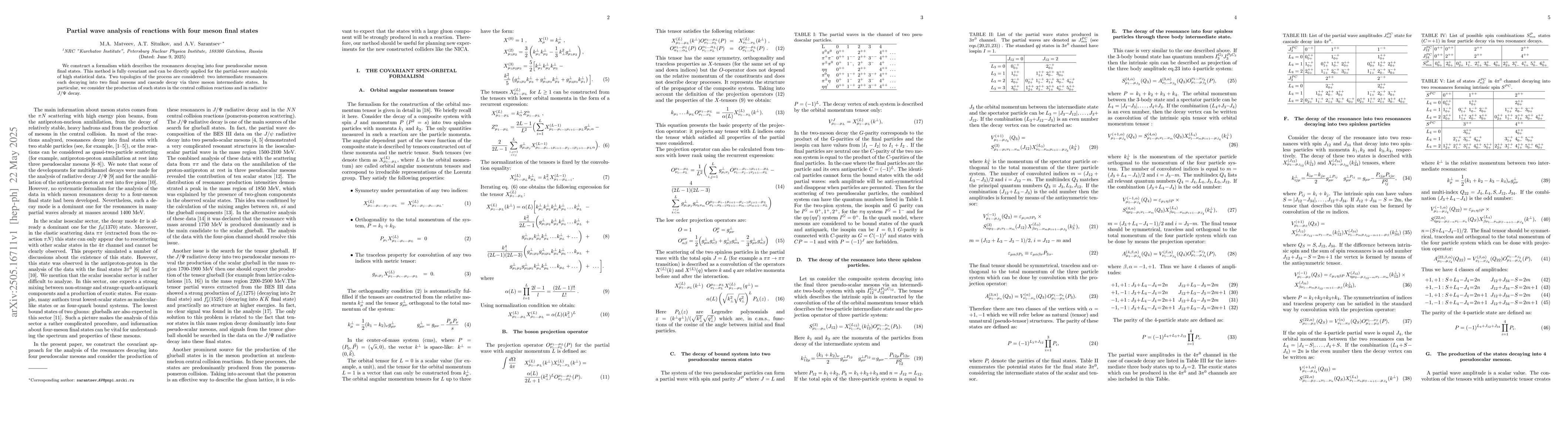 The research develops a fully covariant formalism for describing resonances decaying into four pseudoscalar meson final states, applicable for high statistical data partial-wave analysis.