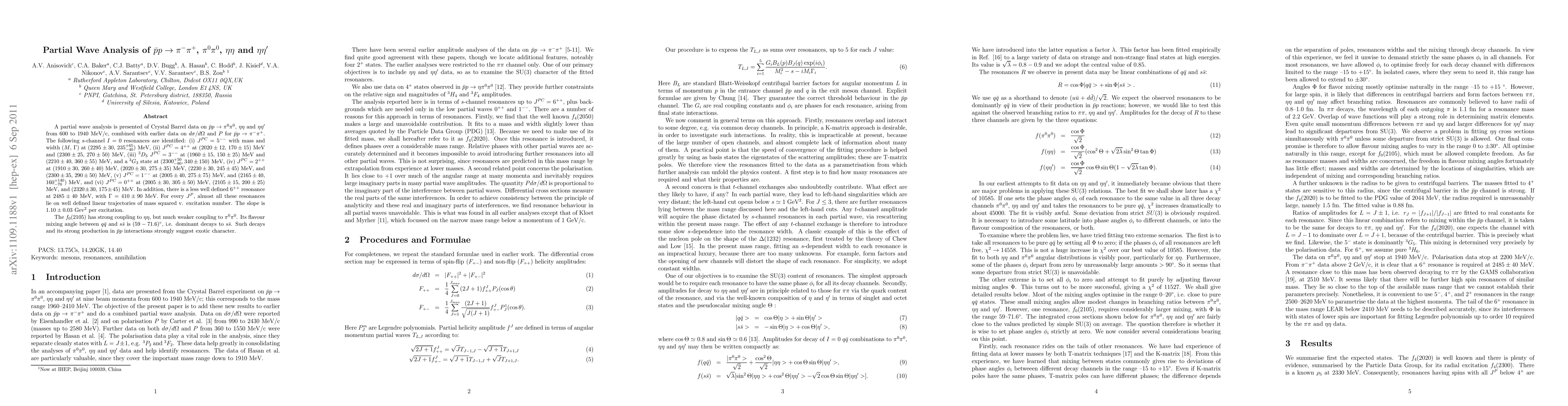 A partial wave analysis is presented of Crystal Barrel data on pbar-p -> pizero-pizero, eta-eta and eta-etaprime from 600 to 1940 MeV/c, combined with earlier data on d\sigma /d\Omega and P for pbar-p->piminus-piplus. The following s-channel I=0 resonances are identified: (i) J^{PC} = 5^{--} with mass and width (M,\Gamma) at (2295+-30,235^{+65}_{-40}) MeV, (ii) J^{PC} = 4^{++} at (2020+-12, 170+-15) MeV and (2300+-25, 270+-50) MeV, (iii) 3D3 JPC = 3^{--} at (1960+-15, 150+-25) MeV and (2210+-4$, 360+-55) MeV, and a 3G3 state at (2300 ^{+50}_{-80}, 340+-150) MeV, (iv) JPC = 2^{++} at (1910+-30, 260+-40) MeV, (2020+-30, 275+-35) MeV, (2230+-30, 245+-45) MeV, and (2300+-35, 290+-50) MeV, (v) JPC = 1^{--} at (2005+-40, 275+-75) MeV, and (2165+-40, 160 ^{+140}_{-70}) MeV, and (vi) JPC = 0^{++} at (2005+-30, 305+-50) MeV, (2105+-15, 200+-25) MeV, and (2320+-30, 175+-45) MeV. In addition, there is a less well defined 6^{++} resonance at 2485+-40 MeV, with Gamma = 410+-90 MeV. For every JP, almost all these resonances lie on well defined linear trajectories of mass squared v. excitation number. The slope is 1.10+-0.03 Gev^2 per excitation. The f_0(2105) has strong coupling to eta-\eta, but much weaker coupling to pizero-pizero. Its flavour mixing angle between q-qbar and s-sbar is (59-71.6)deg, i.e. dominant decays to s-sbar. Such decays and its strong production in pbar-p interactions strongly suggest exotic character.
