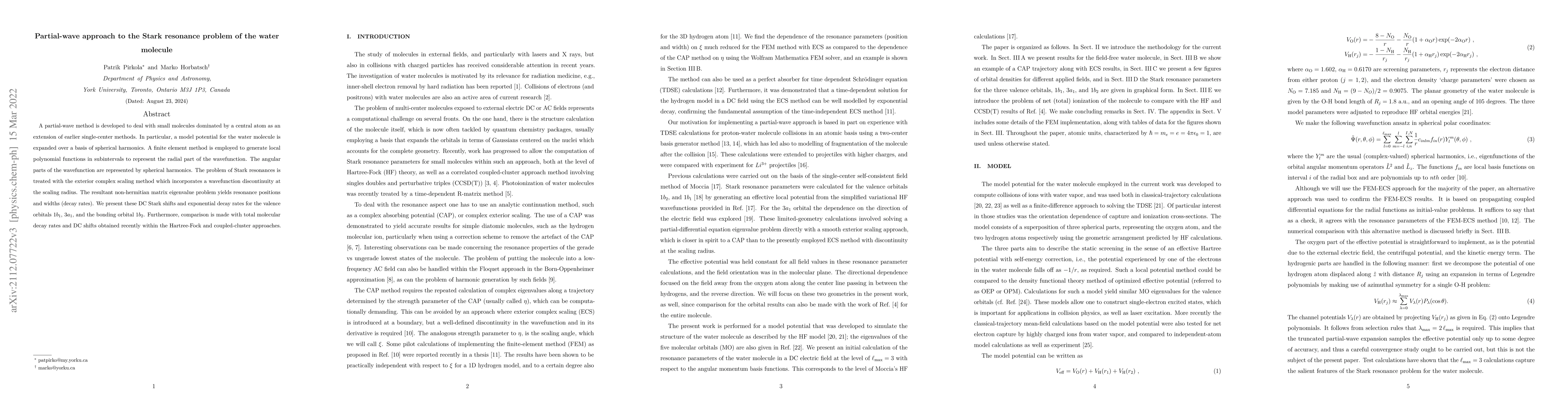 This paper develops a partial-wave method to analyze Stark resonance in the water molecule, employing a model potential expanded over spherical harmonics and using a finite element method for radial functions. The study presents DC Stark shifts and decay rates for specific orbitals, comparing results with those obtained from Hartree-Fock and coupled-cluster approaches.