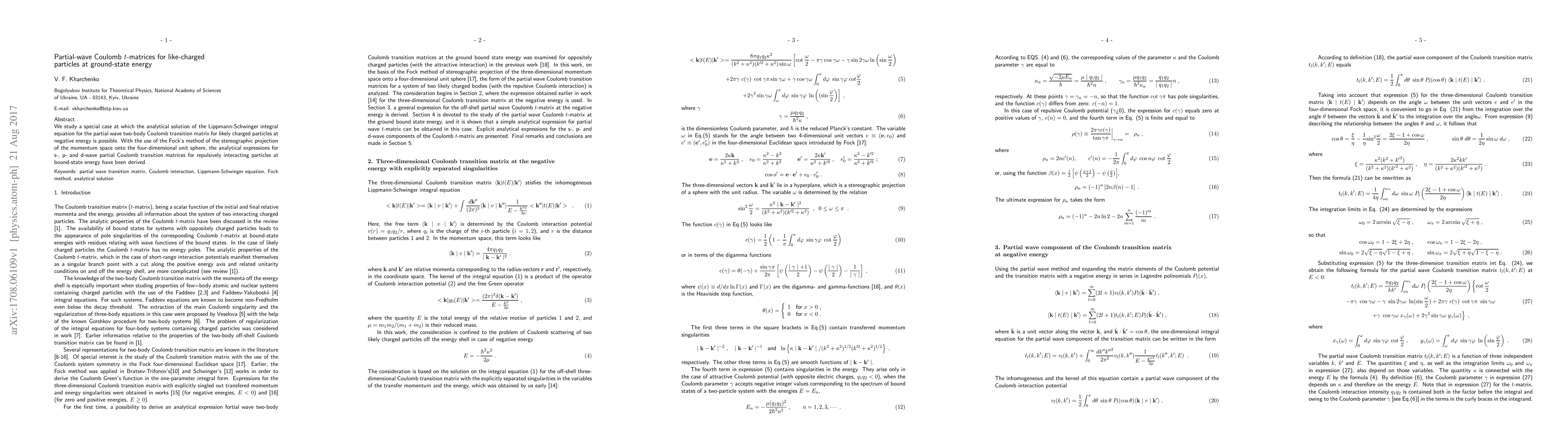 This paper derives analytical expressions for s-, p-, and d-wave partial Coulomb transition matrices for like-charged particles at bound-state energy using Fock's method of stereographic projection. The study focuses on a special case where the analytical solution of the Lippmann-Schwinger integral equation is feasible.