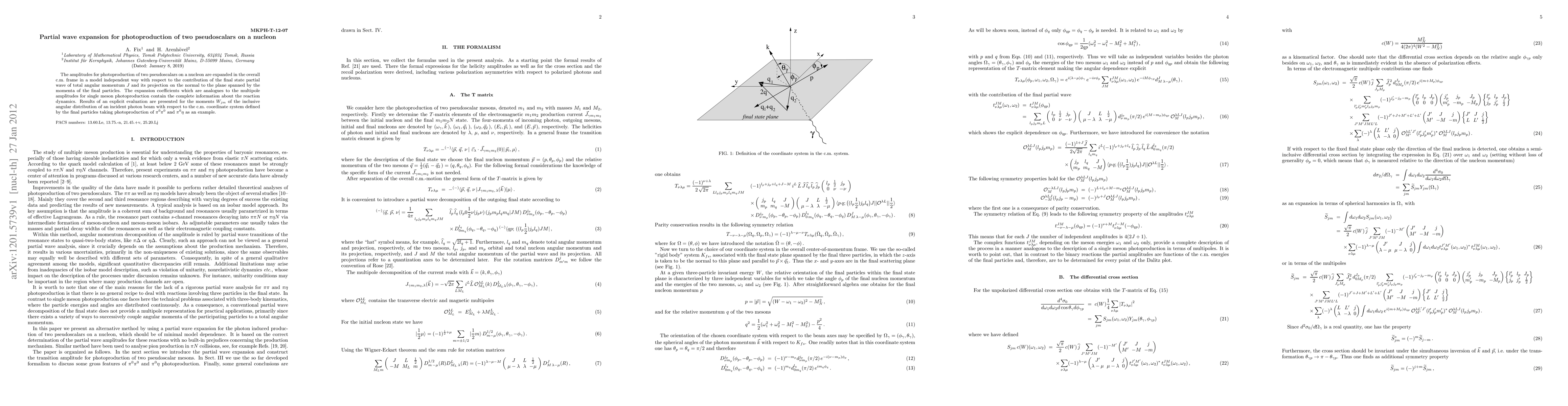 The amplitudes for photoproduction of two pseudoscalars on a nucleon are expanded in the overall c.m. frame in a model independent way with respect to the contribution of the final state partial wave of total angular momentum $J$ and its projection on the normal to the plane spanned by the momenta of the final particles. The expansion coefficients which are analogues to the multipole amplitudes for single meson photoproduction contain the complete information about the reaction dynamics. Results of an explicit evaluation are presented for the moments $W_{jm}$ of the inclusive angular distribution of an incident photon beam with respect to the c.m.\ coordinate system defined by the final particles taking photoproduction of $\pi^0\pi^0$ and $\pi^0\eta$ as an example.