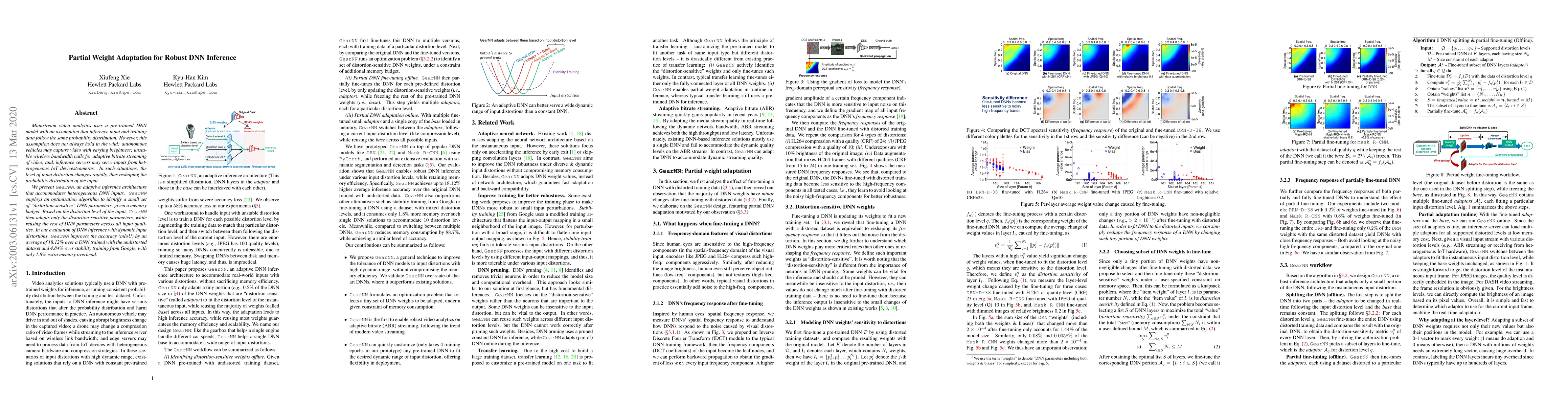 GearNN is an adaptive DNN inference architecture designed to handle dynamic input distortions by selectively adapting a small set of "distortion-sensitive" parameters, while maintaining constant parameters, leading to improved accuracy with minimal memory overhead. It outperforms traditional DNNs and stability-trained models in scenarios with varying input conditions.