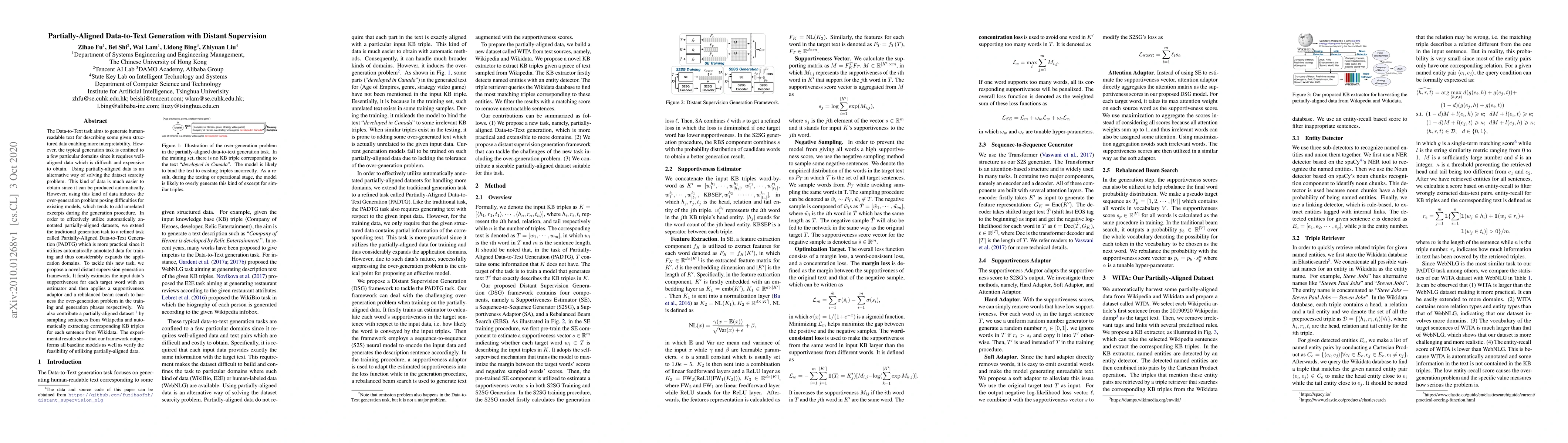This paper proposes a novel framework for Partially-Aligned Data-to-Text Generation (PADTG) to address the scarcity of well-aligned datasets. It introduces a distant supervision method to estimate data supportiveness and mitigate over-generation, demonstrating improved performance over baseline models.