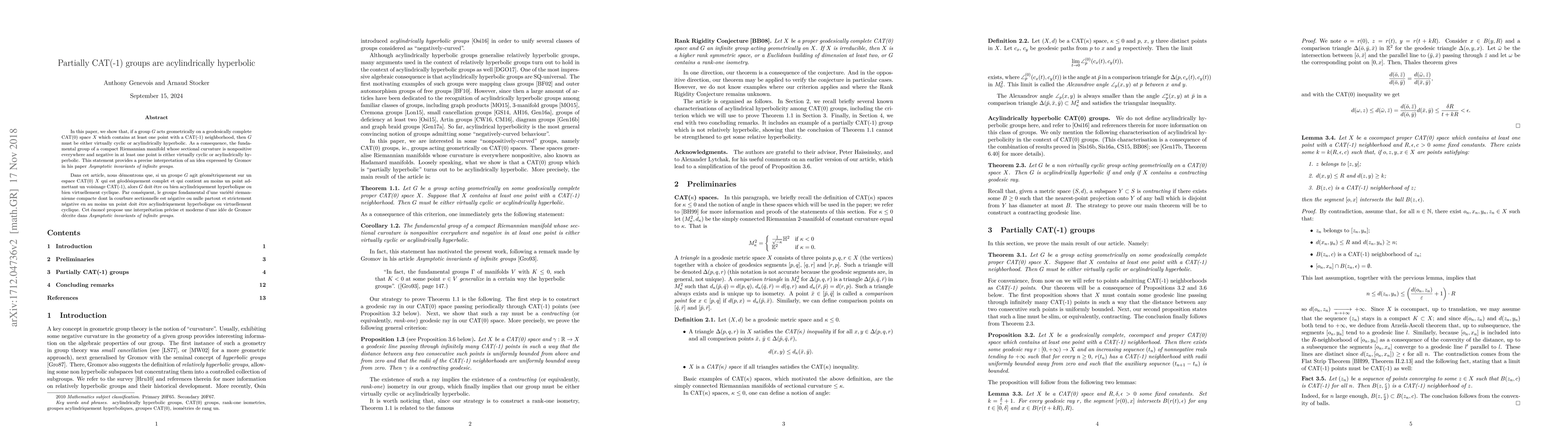 This paper demonstrates that groups acting geometrically on a geodesically complete CAT(0) space with a CAT(-1) neighborhood are either virtually cyclic or acylindrically hyperbolic, extending Gromov's ideas on asymptotic invariants. It concludes that the fundamental group of a compact Riemannian manifold with nonpositive and at least one negative sectional curvature is similarly classified.