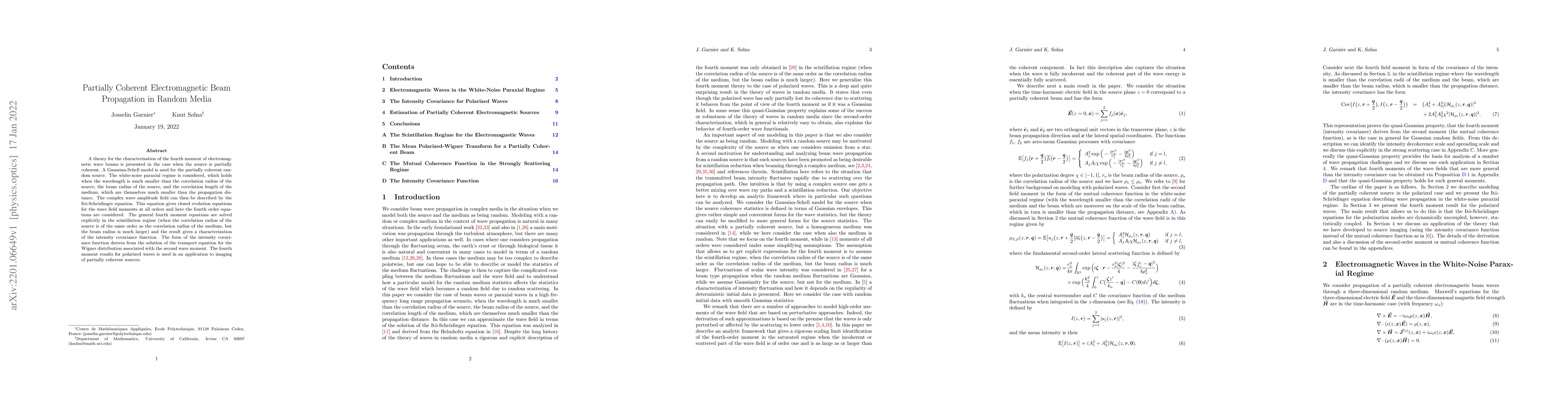 A theory for the characterization of the fourth moment of electromagnetic wave beams is presented in the case when the source is partially coherent. A Gaussian-Schell model is used for the partially coherent random source. The white-noise paraxial regime is considered, which holds when the wavelength is much smaller than the correlation radius of the source, the beam radius of the source, and the correlation length of the medium, which are themselves much smaller than the propagation distance. The complex wave amplitude field can then be described by the It\^o-Schr\"odinger equation. This equation gives closed evolution equations for the wave field moments at all orders and here the fourth order equations are considered. The general fourth moment equations are solved explicitly in the scintillation regime (when the correlation radius of the source is of the same order as the correlation radius of the medium, but the beam radius is much larger) and the result gives a characterization of the intensity covariance function. The form of the intensity covariance function derives from the solution of the transport equation for the Wigner distribution associated with the second wave moment. The fourth moment results for polarized waves is used in an application to imaging of partially coherent sources.