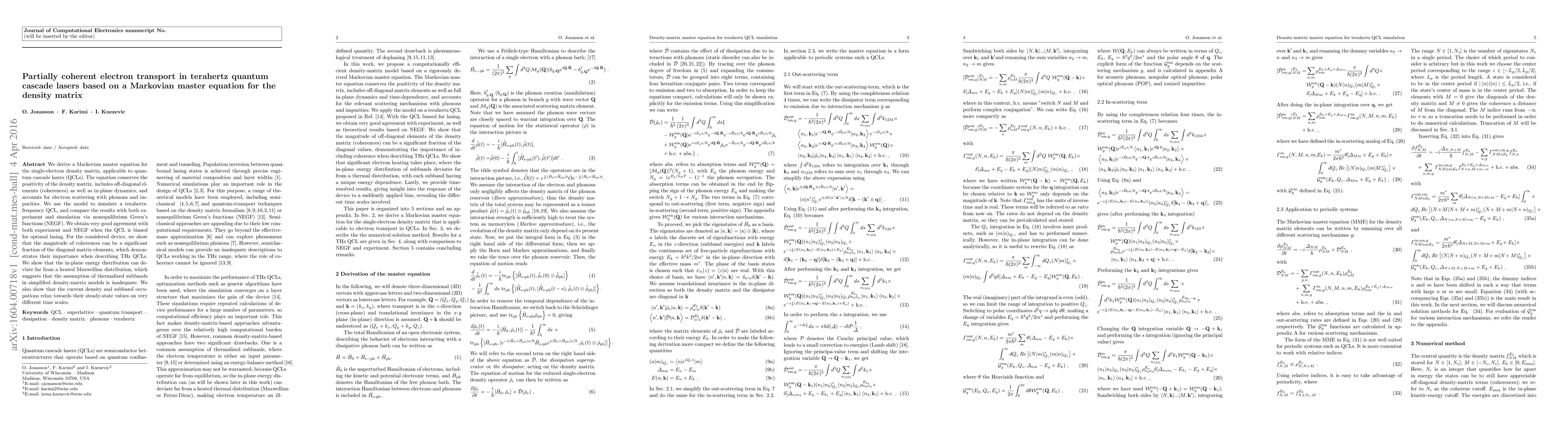 We derive a Markovian master equation for the single-electron density matrix, applicable to quantum cascade lasers (QCLs). The equation conserves the positivity of the density matrix, includes off-diagonal elements (coherences) as well as in-plane dynamics, and accounts for electron scattering with phonons and impurities. We use the model to simulate a terahertz-frequency QCL, and compare the results with both experiment and simulation via nonequilibrium Green's functions (NEGF). We obtain very good agreement with both experiment and NEGF when the QCL is biased for optimal lasing. For the considered device, we show that the magnitude of coherences can be a significant fraction of the diagonal matrix elements, which demonstrates their importance when describing THz QCLs. We show that the in-plane energy distribution can deviate far from a heated Maxwellian distribution, which suggests that the assumption of thermalized subbands in simplified density-matrix models is inadequate. We also show that the current density and subband occupations relax towards their steady-state values on very different time scales.